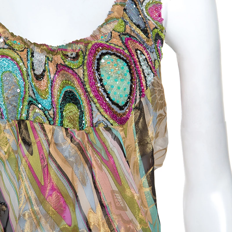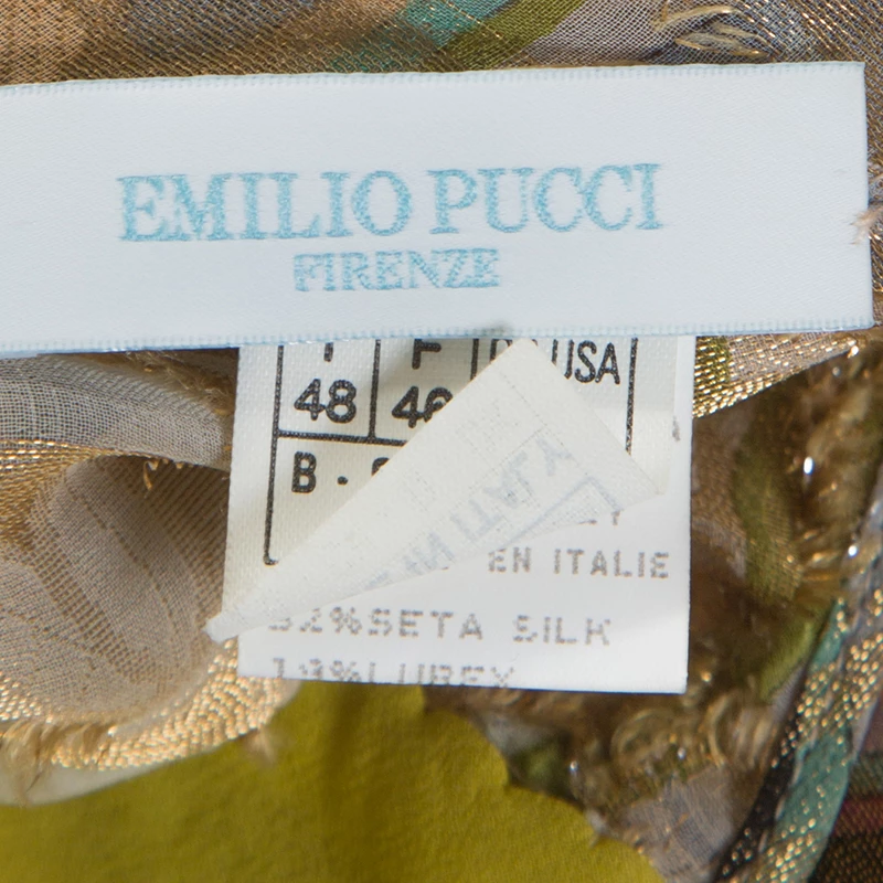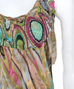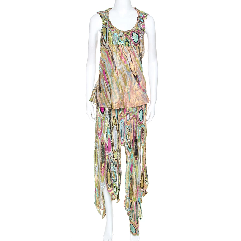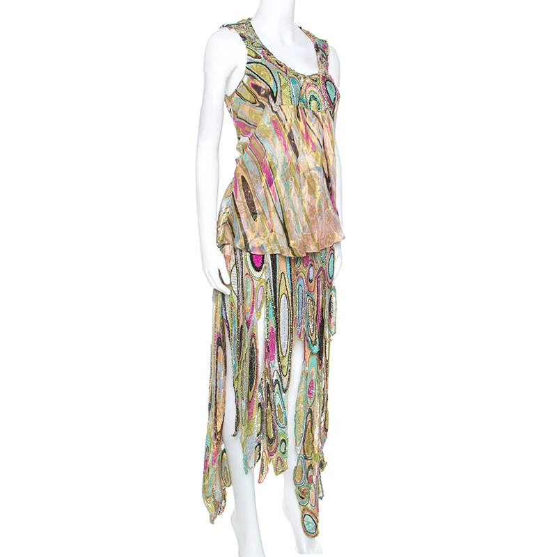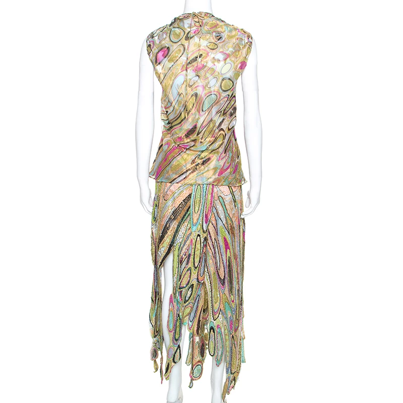 Known for classy designs and silhouettes, Emilio Pucci is adored by many. Designed with colourful patterns all over, this top and skirt set is made from quality fabrics. The set is beautified with beads and sequins.