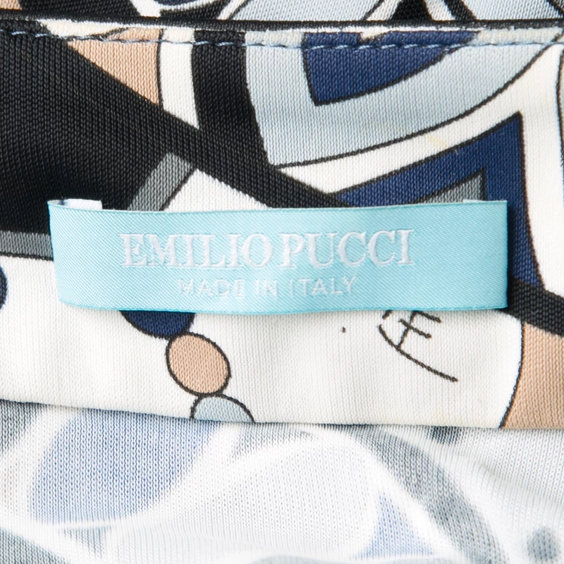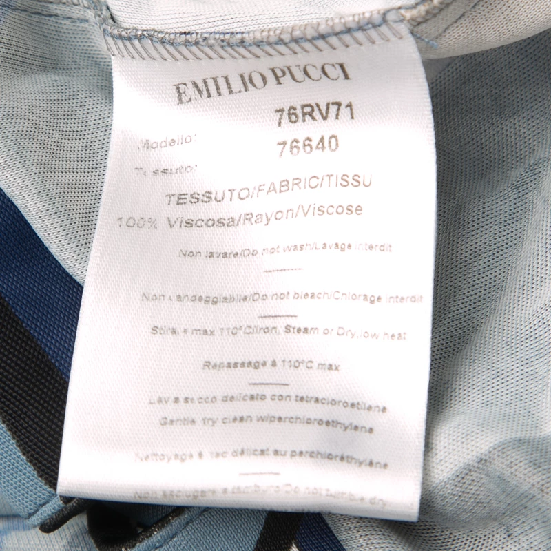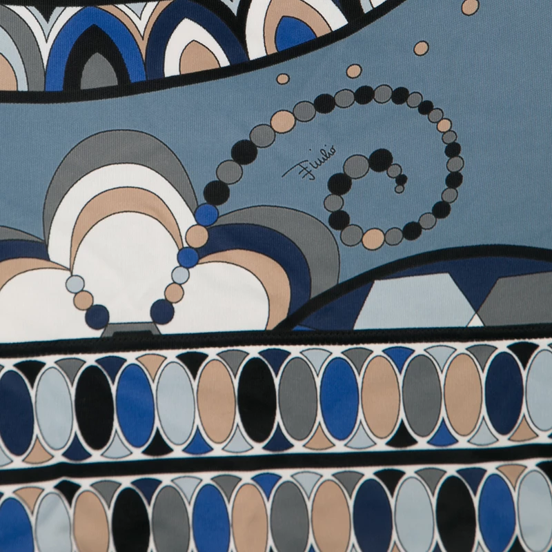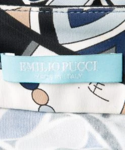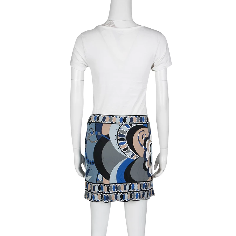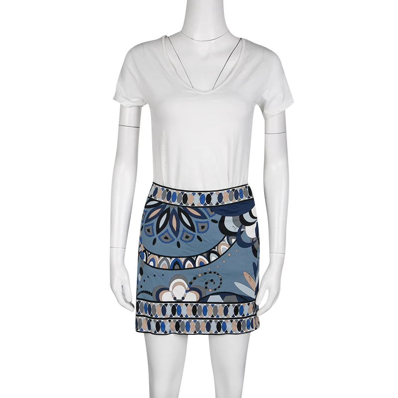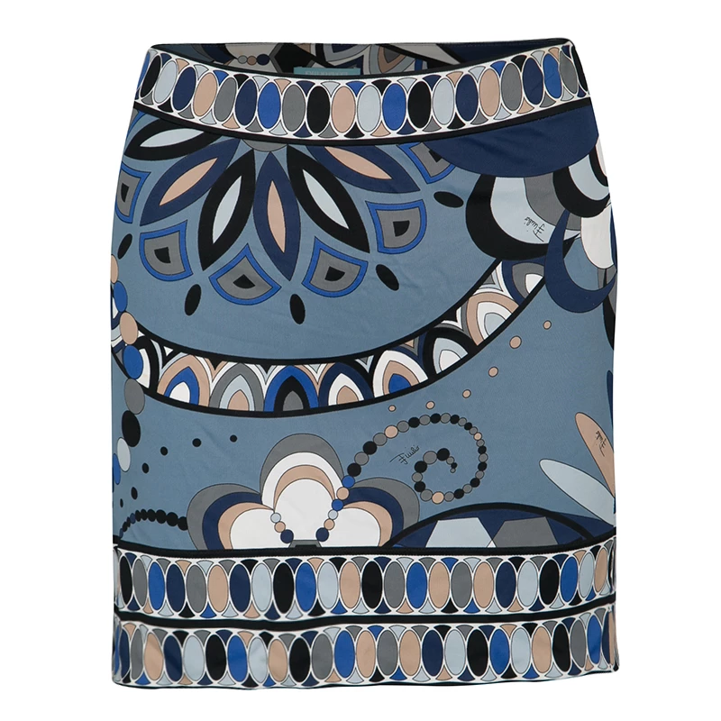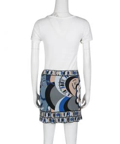 One would find kaleidoscopic prints majorly dominating the Emilio Pucci designs, and so does this mini skirt. Crafted in blue color, the skirt features a multicolor print that adds a fun, artistic touch to the piece. It is graced with a sharp fit that you would love to flaunt with a stylish ruffled top and gladiator sandals.