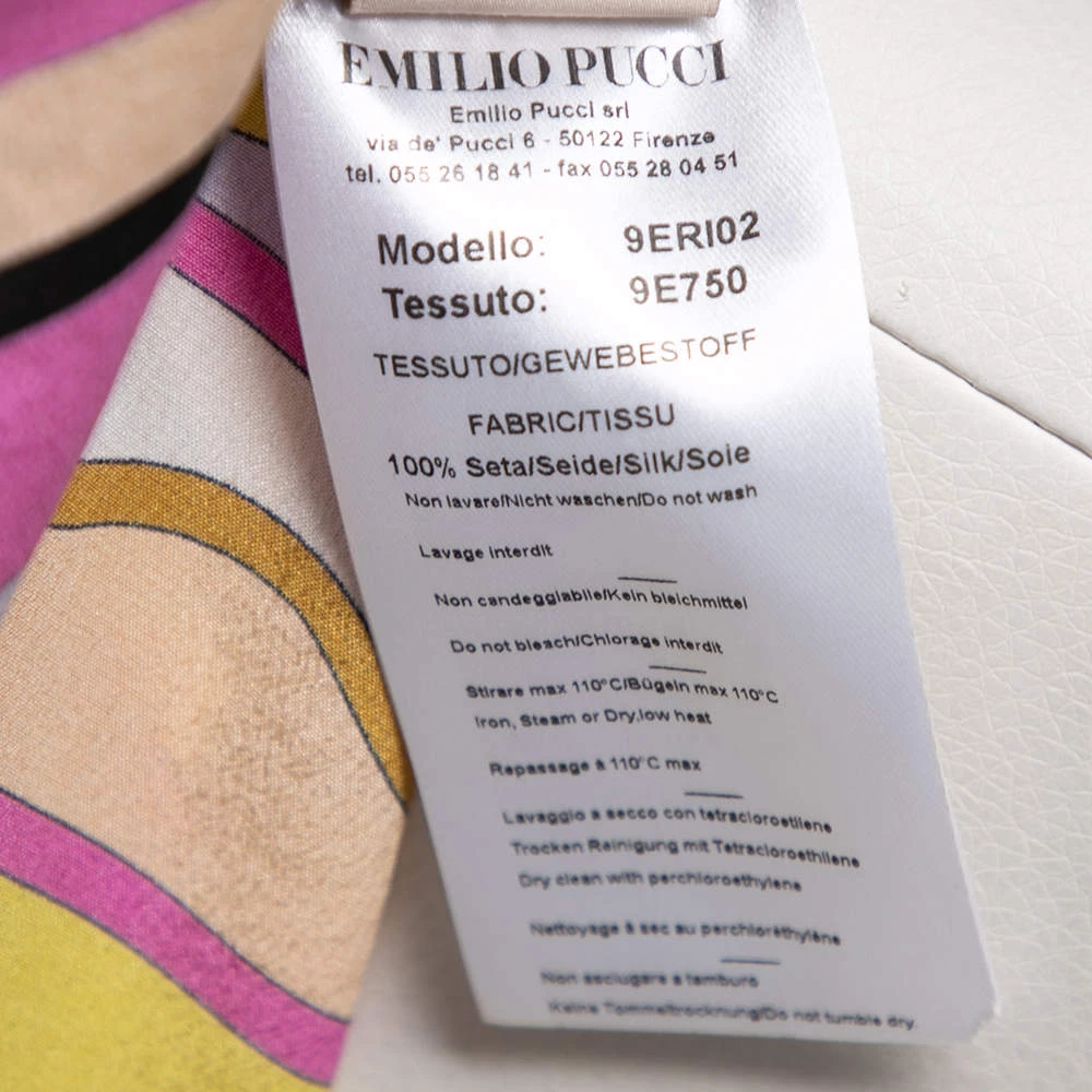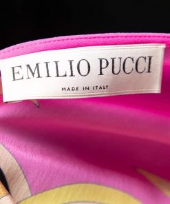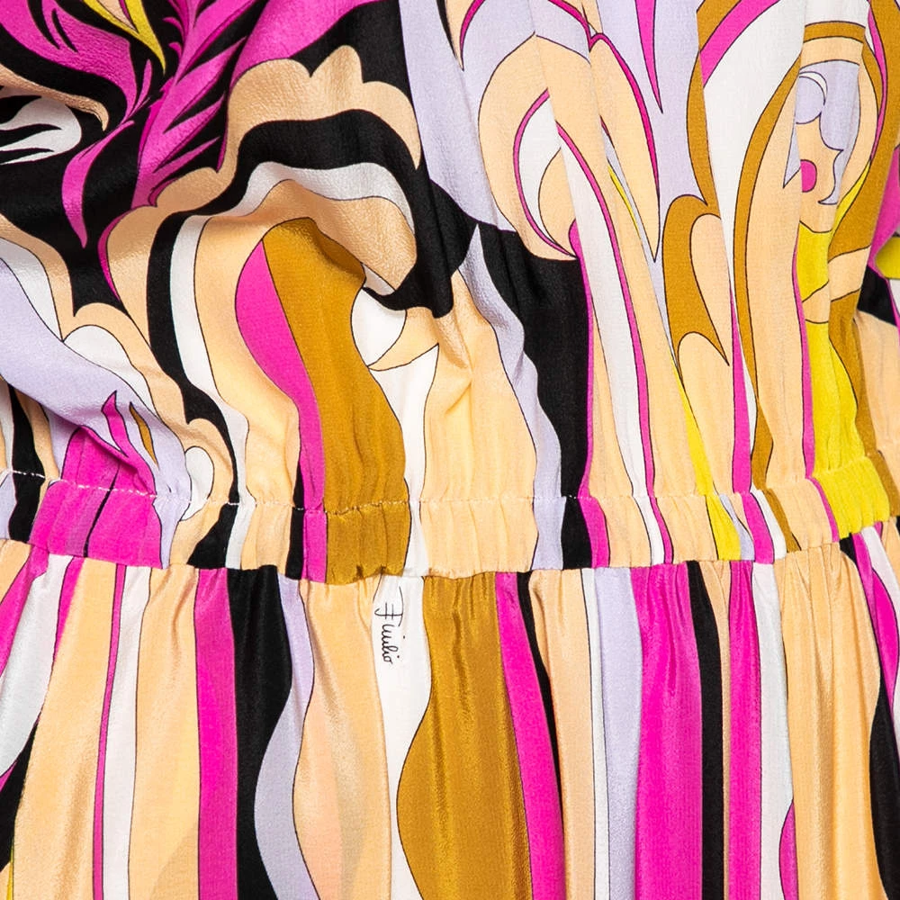 Attractive prints in varied colors define this Emilio Pucci dress. Crafted from silk, it has been complemented with short sleeves, an elasticized waist, and a fine neckline. The relaxed silhouette of this maxi dress makes it an ideal summer day outfit.