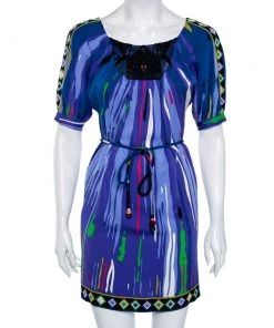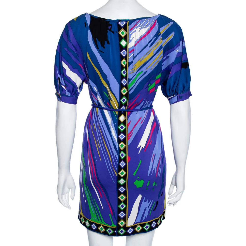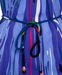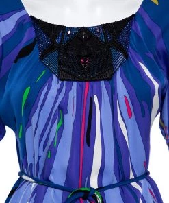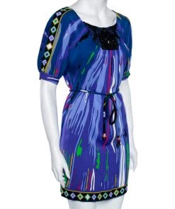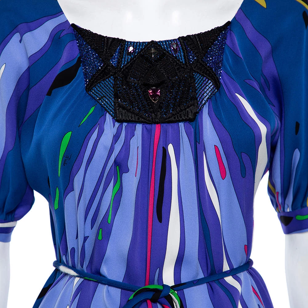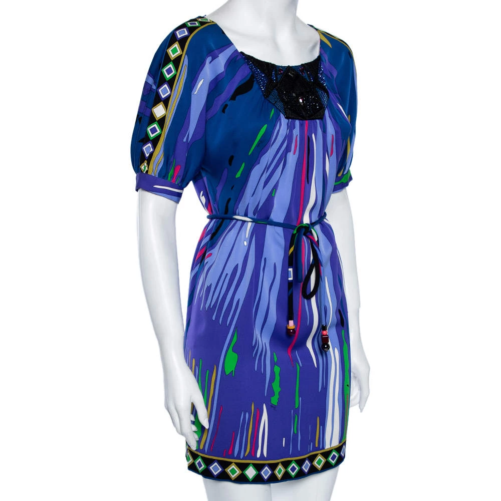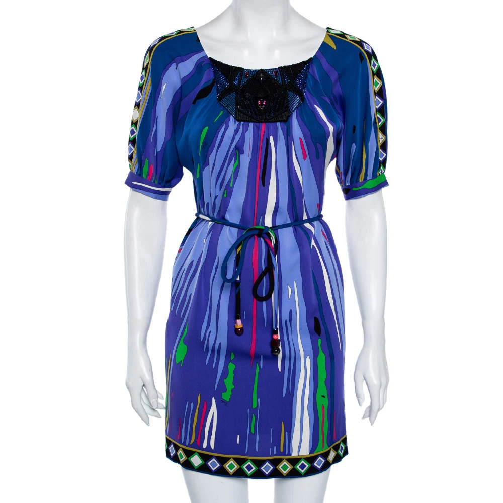 Let your exceptional styling choices be evident as you don this dress from Emilio Pucci. It has been designed using multicolored printed silk and comes adorned with delicate embellishments and a belted detail. This shift dress is an ideal pick for a casual day out.