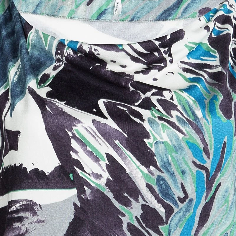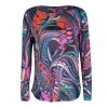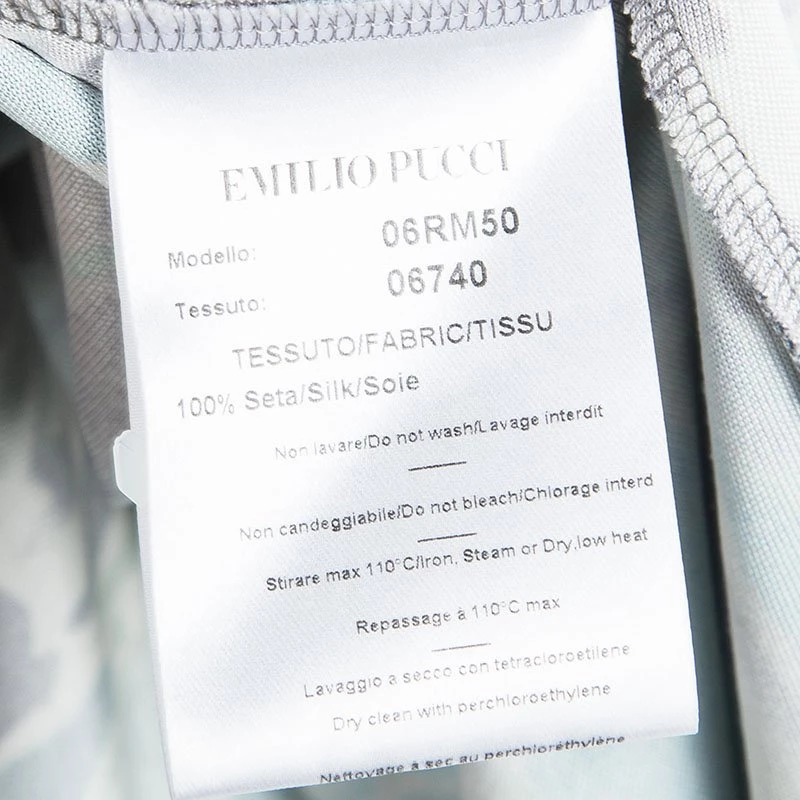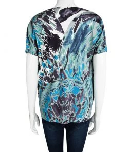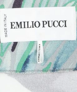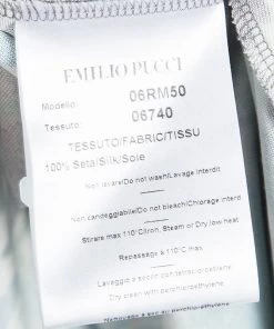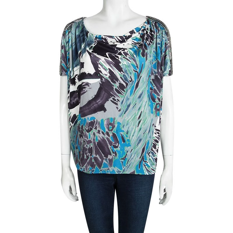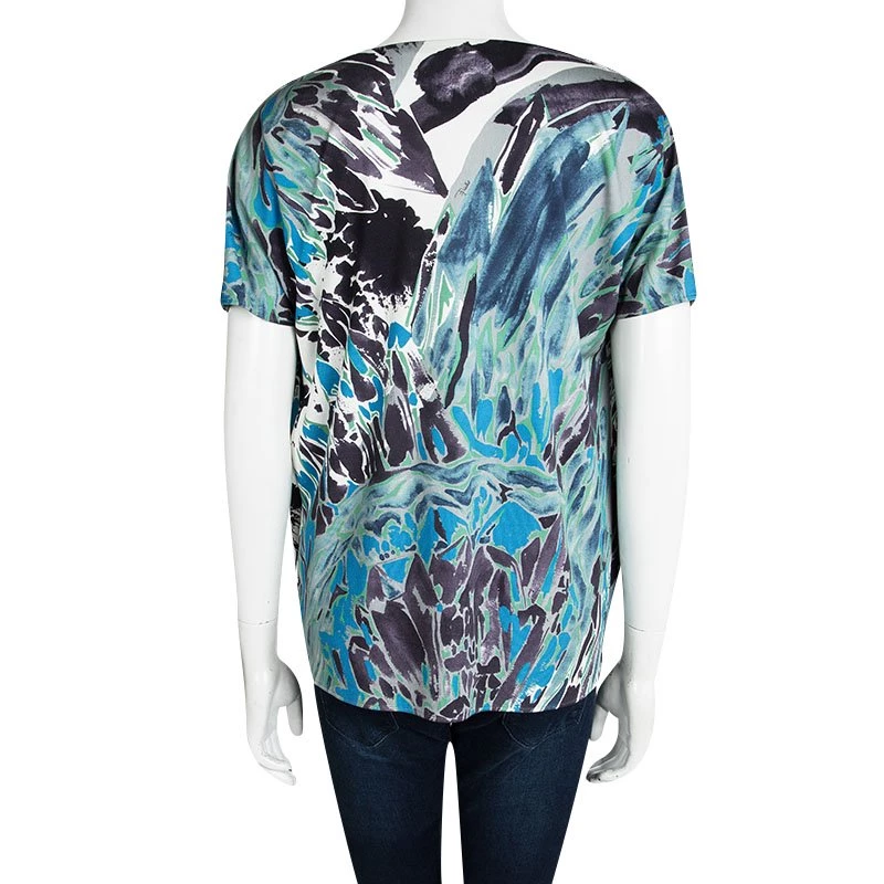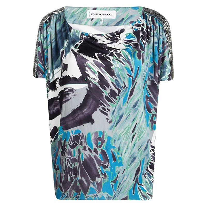 Designed artistically in Italy, this Emilio Pucci short sleeve top is pleasing and delightful. The top is made of 100% silk and features a vibrant multicolor abstract print all over, a round neckline and a simple silhouette. This creation shines with the impressive stone embellished sleeves that render a unique and distinctive appearance. Pair it with dark denims and printed loafers for a fun-filled outing.