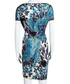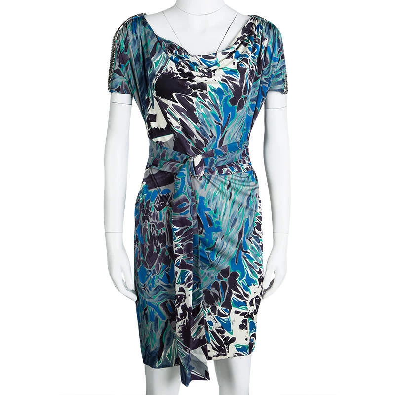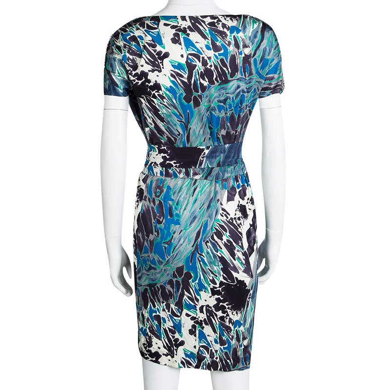 This belted dress from Emilio Pucci is as delighting as it is gorgeous and stylish at the same time. Made from silk, the dress flaunts a draped neck, short sleeves and a belt at the waist. Designed to perfection, this multicolor printed dress will look fabulous with pink sandals.