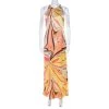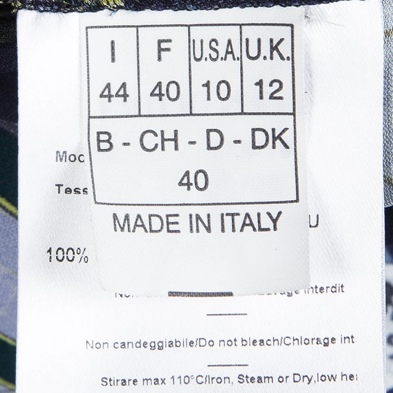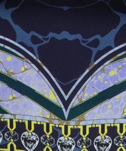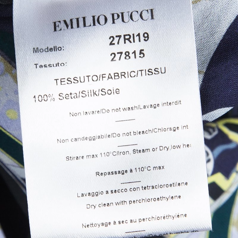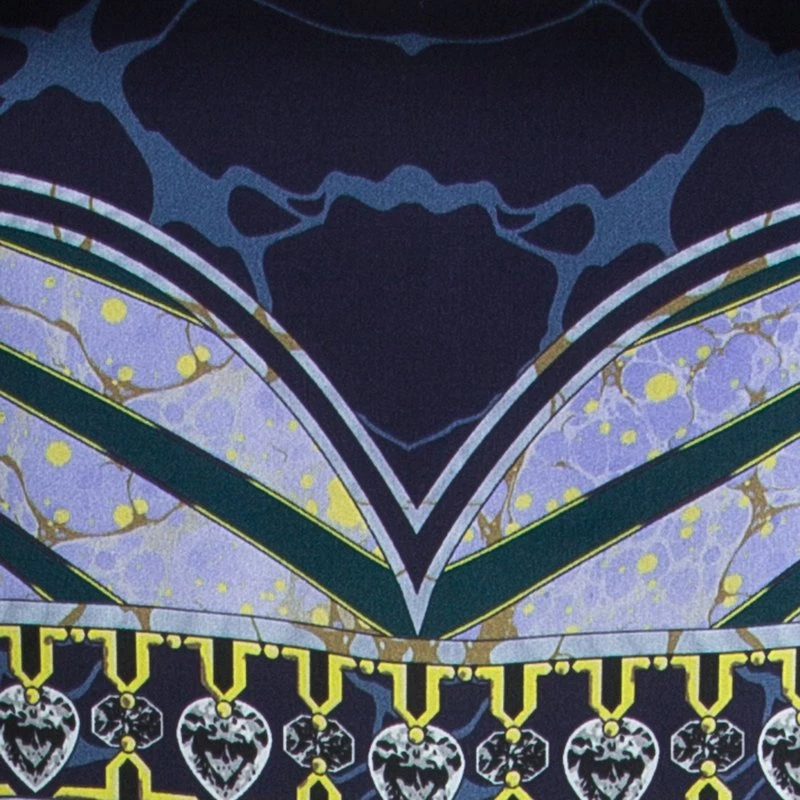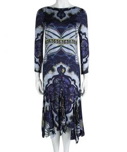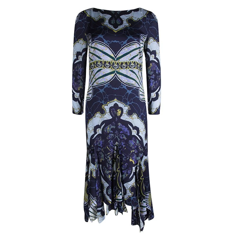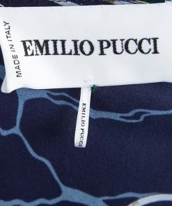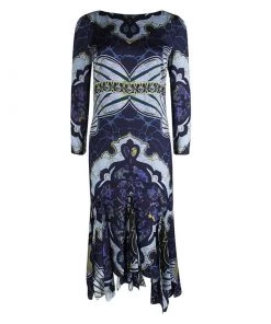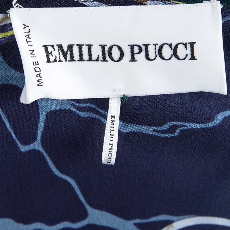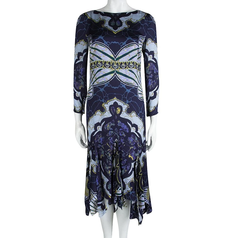 A perfect evening attire, this printed dress by Emilio Pucci is truly flamboyant. Made from 100% silk the blue dress has a bateau neckline and 3/4th sleeves. The dress is fitted with a flared bottom. Team it up with flats or strappy sandals.