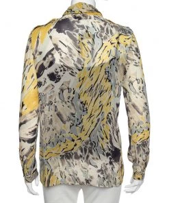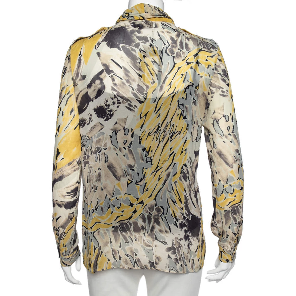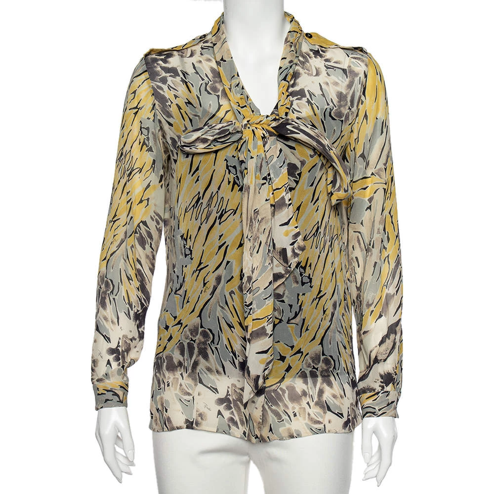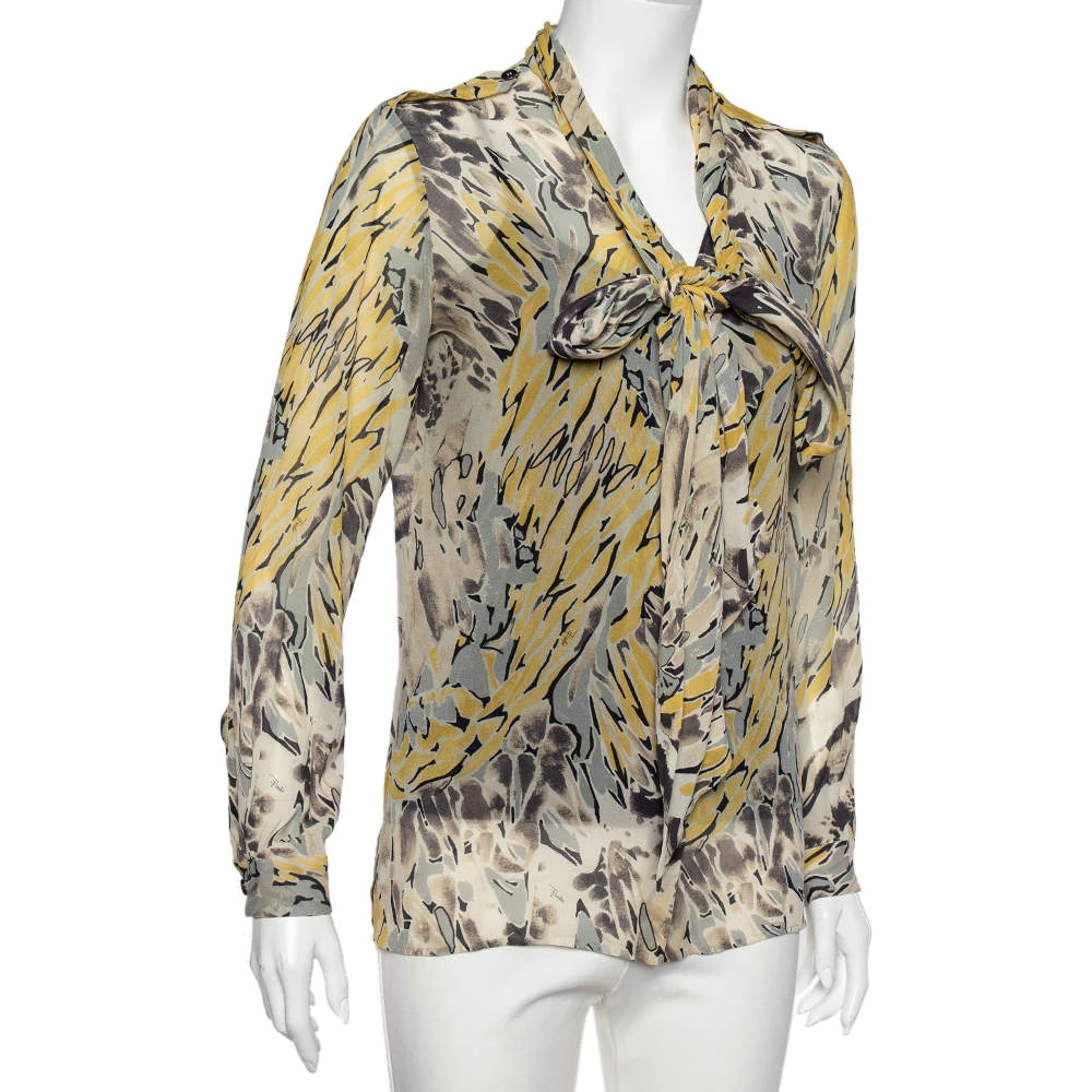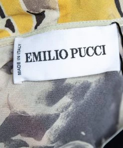By donning this shirt from Emilio Pucci, make comfort and style your priority. The use of multicolored printed silk fabric with a high-quality design makes this top an ideal pick for events. It flaunts a neck-tie detail on the front.