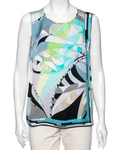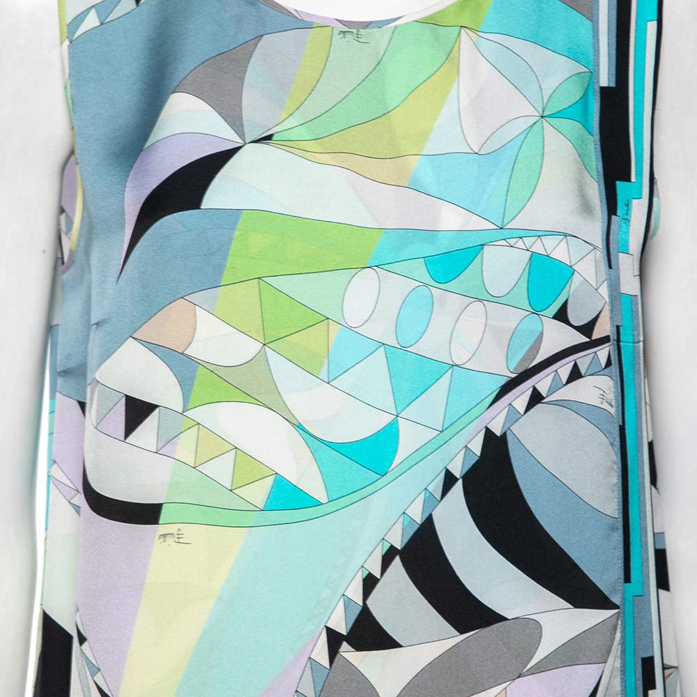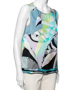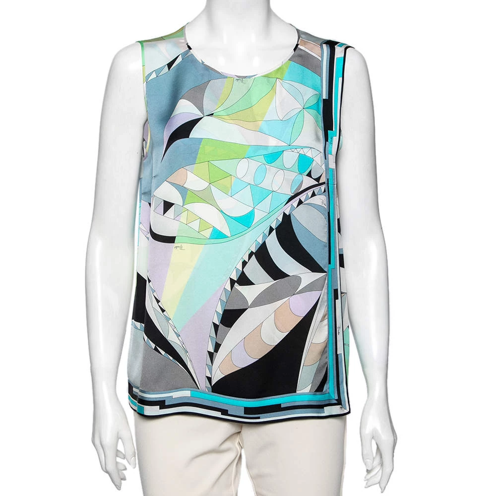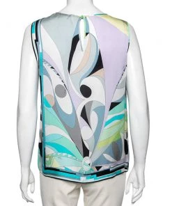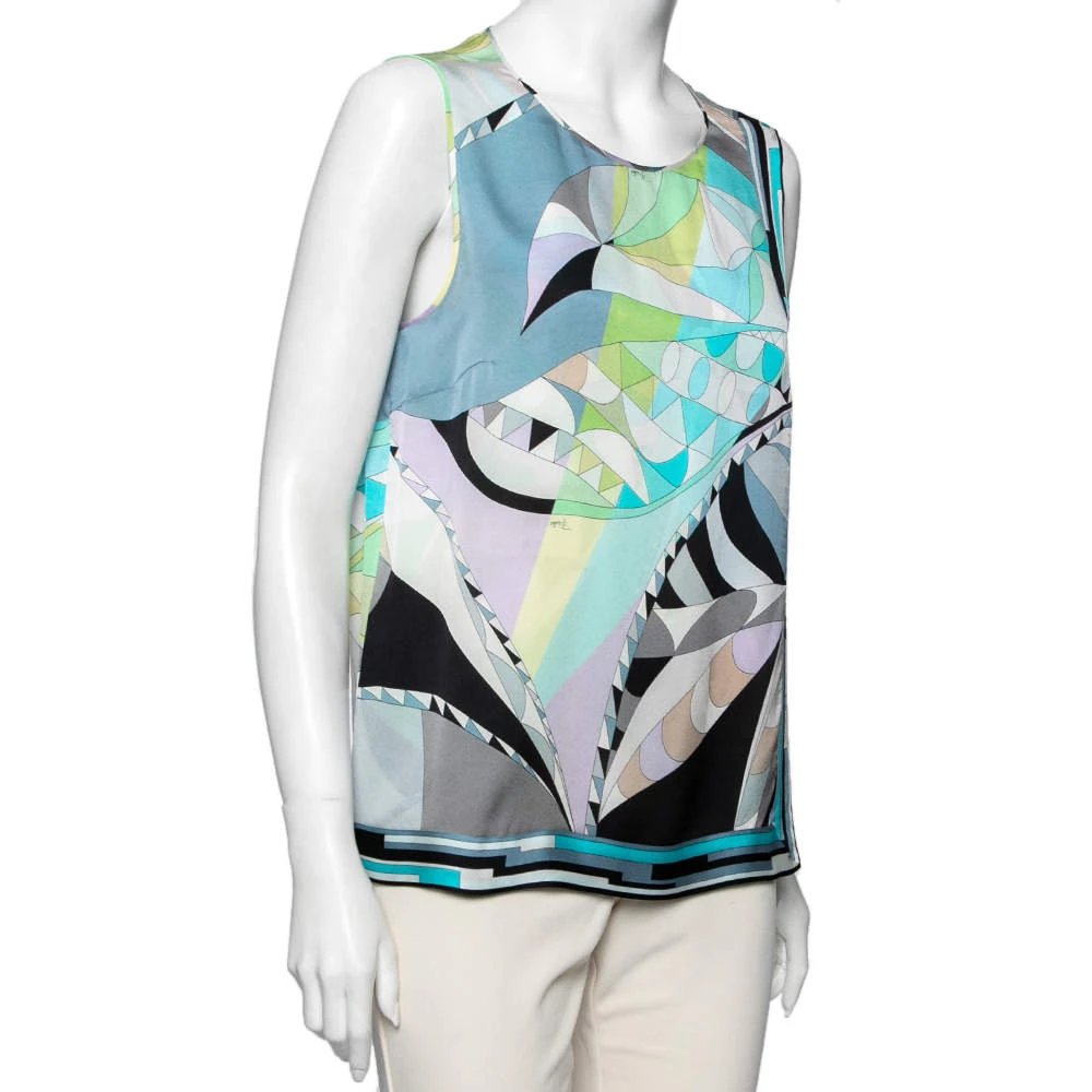 This top from the House of Emilio Pucci is a stunning creation you need to own today! It is tailored using multicolored printed silk fabric and is accentuated with a sleeveless style. It has buttoned closure. Achieve a colorful style as you don this beautiful top.