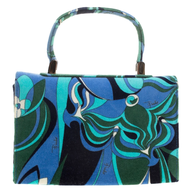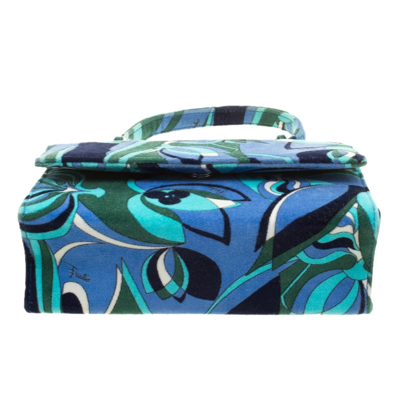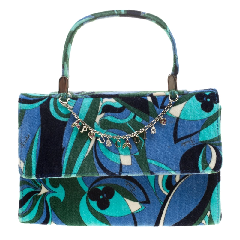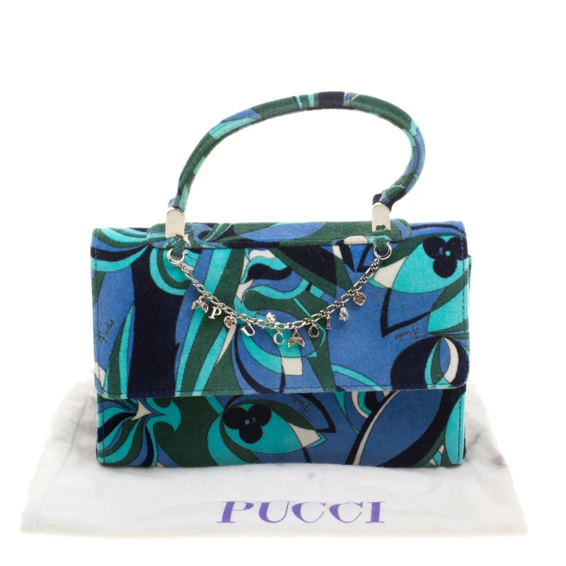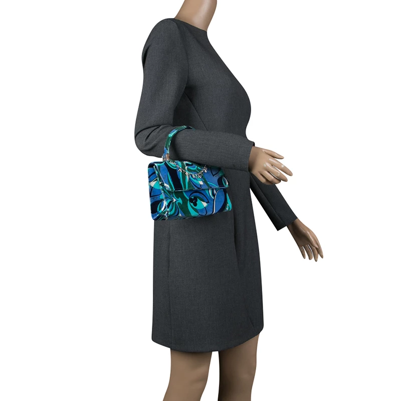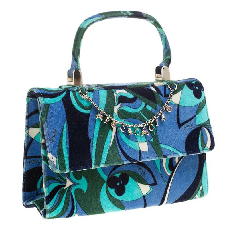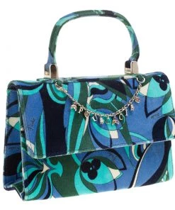 Add some luxurious style to your day time party wear collection with this stunning Emilio Pucci to handle bag. Crafted in velvet fabric with hues of blue and green abstract prints, this bag features a structured shape with a front flap closure and a silver charm chain at the front for that distinct look.