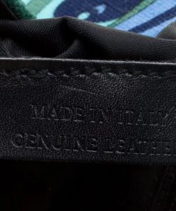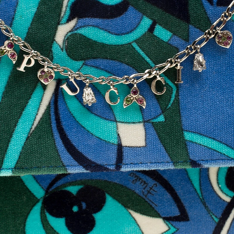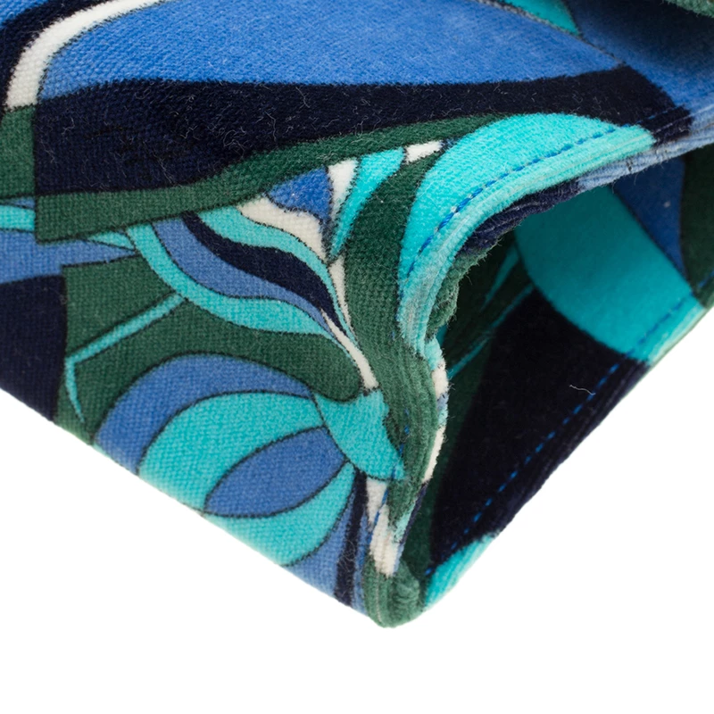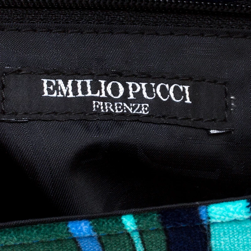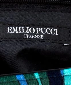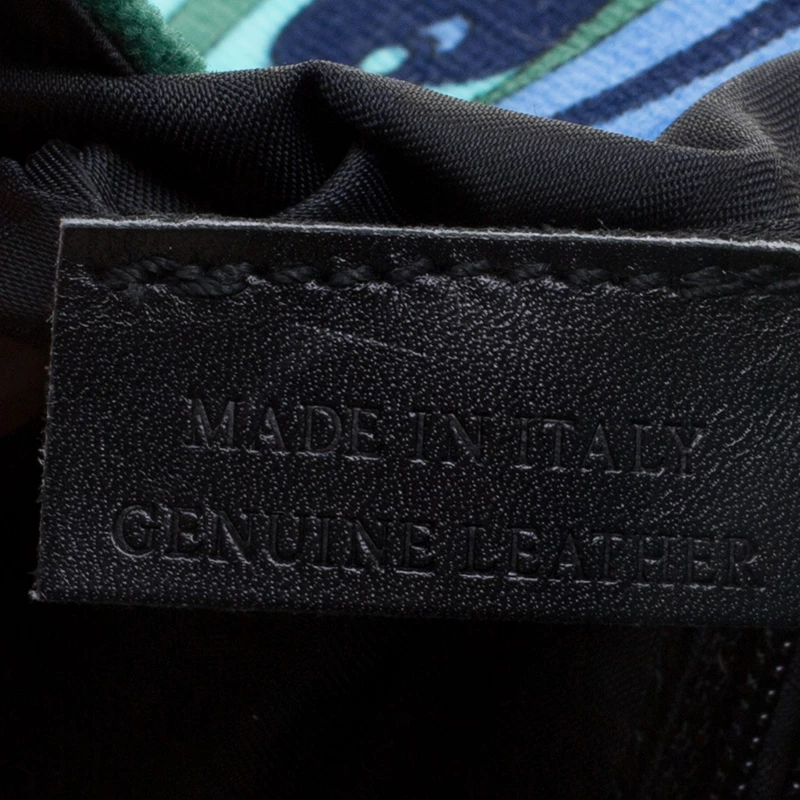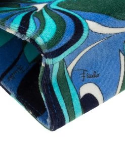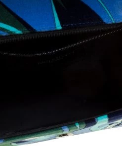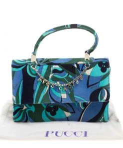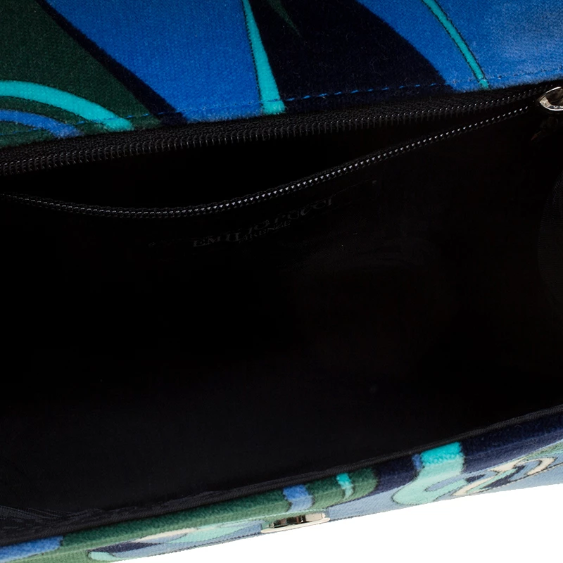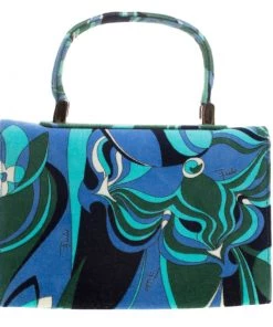 Add some luxurious style to your day time party wear collection with this stunning Emilio Pucci to handle bag. Crafted in velvet fabric with hues of blue and green abstract prints, this bag features a structured shape with a front flap closure and a silver charm chain at the front for that distinct look.