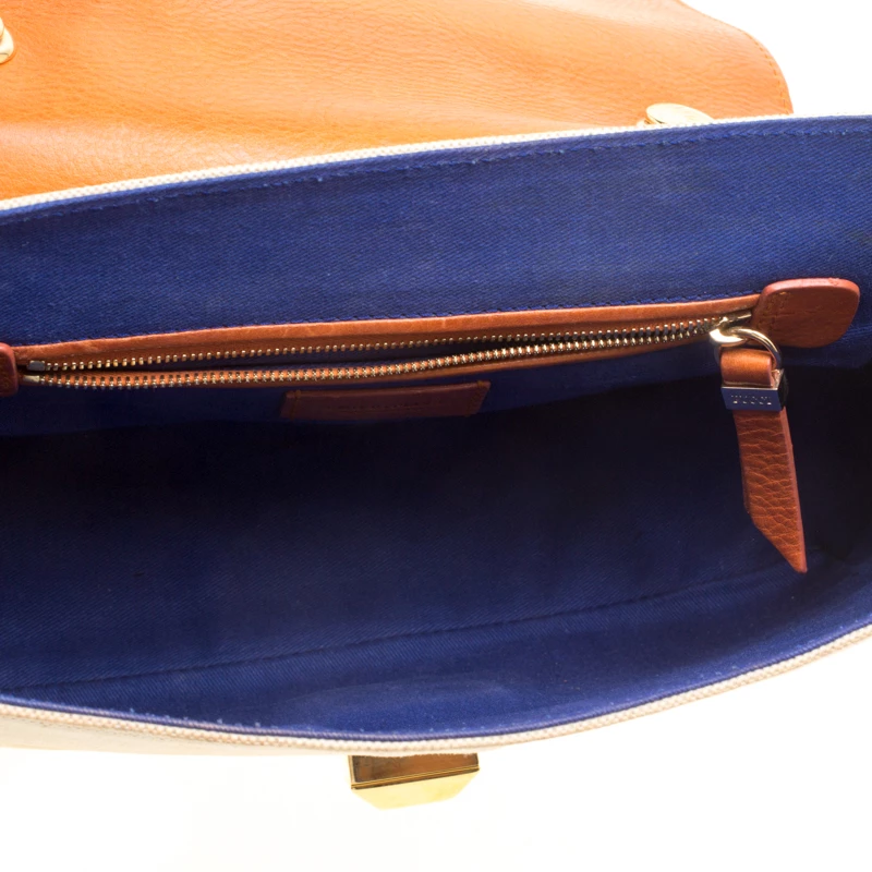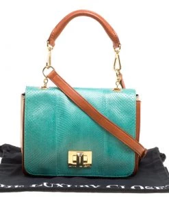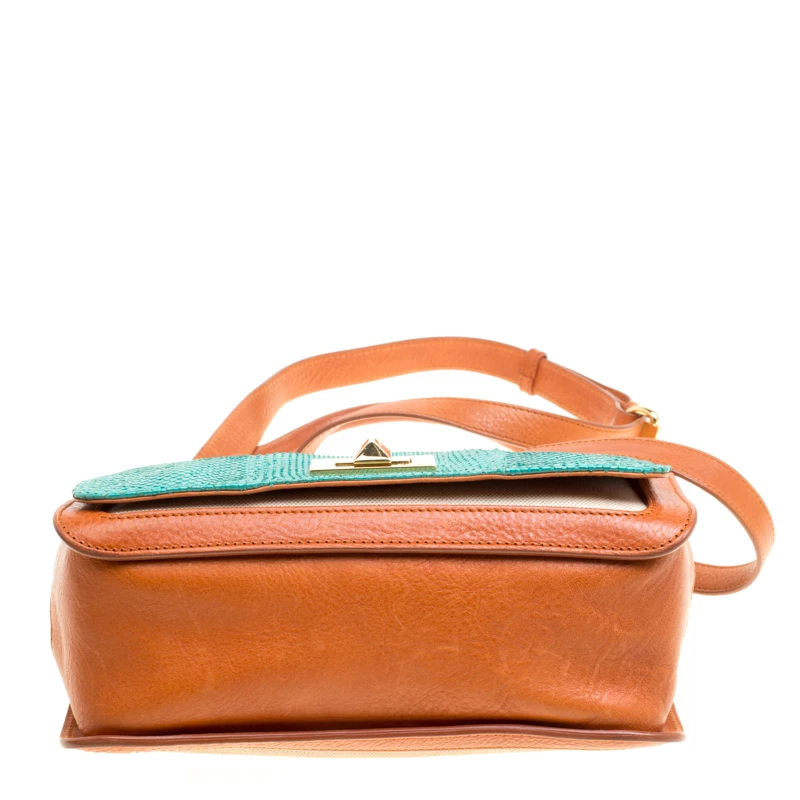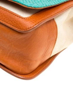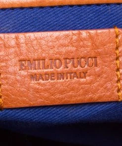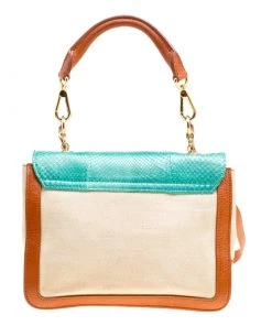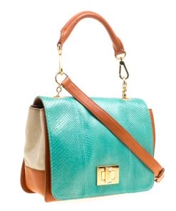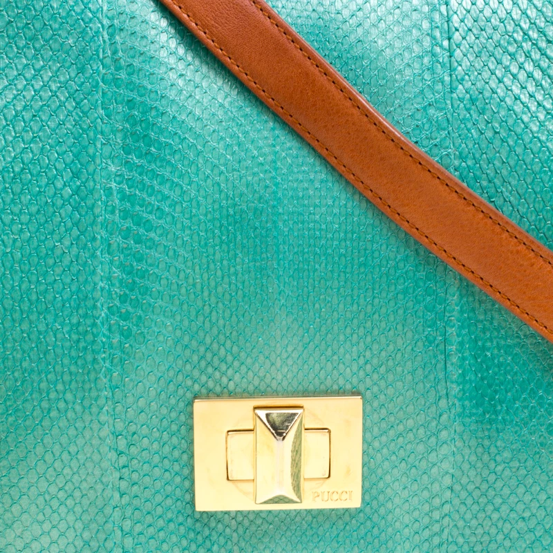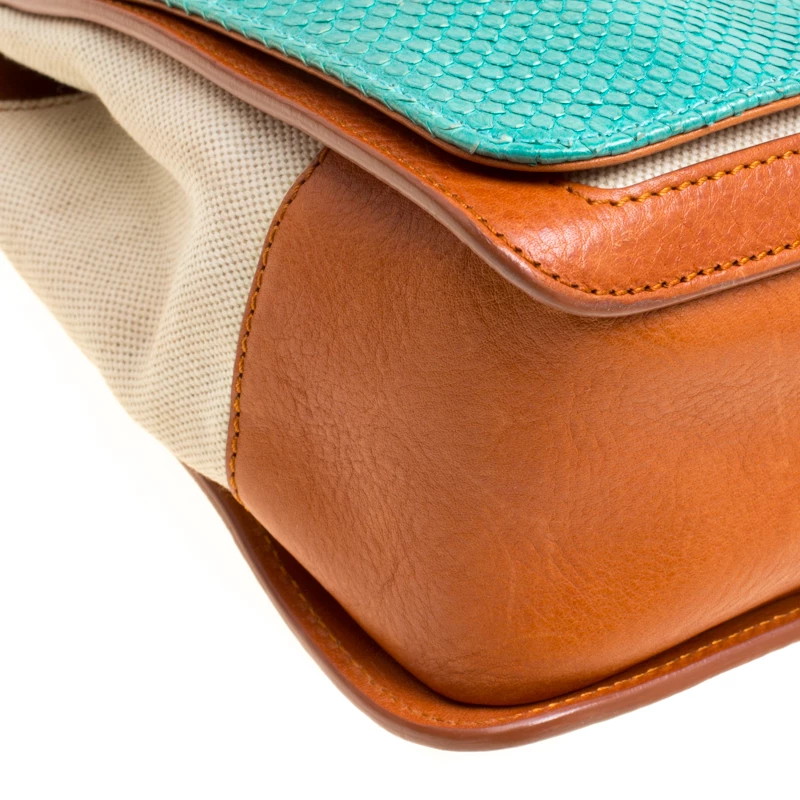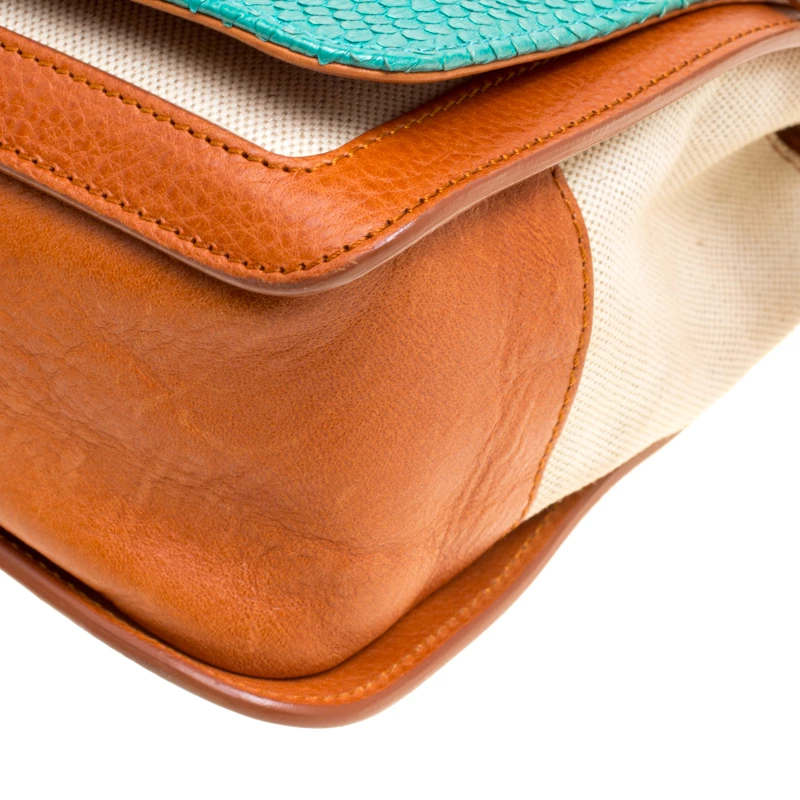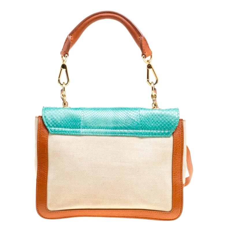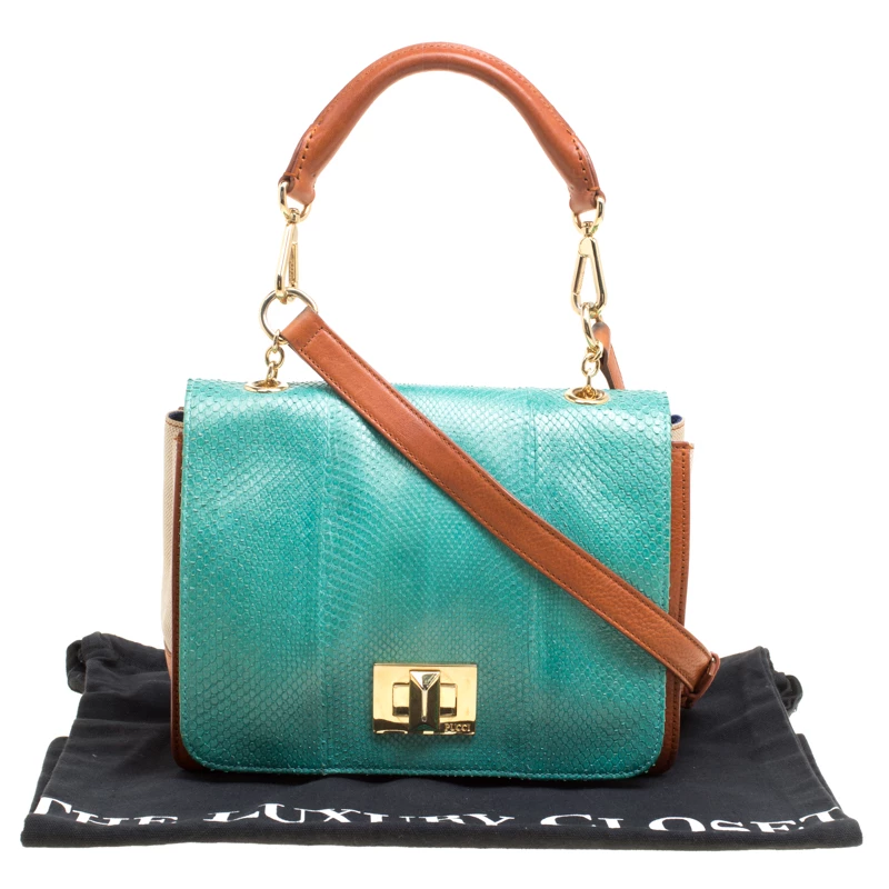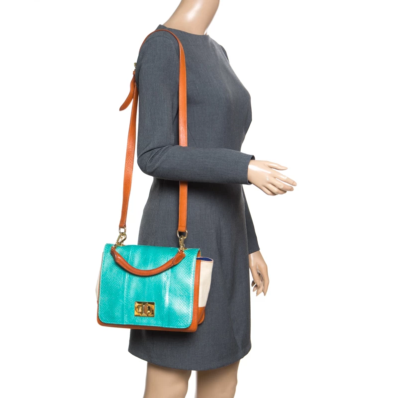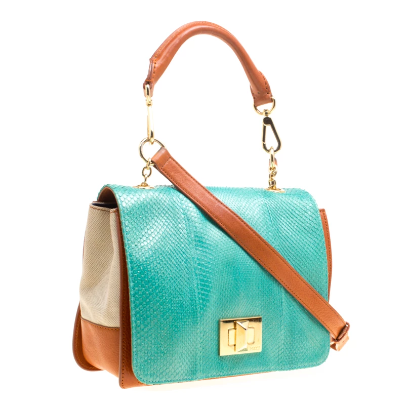 This lovely bag from Emilio Pucci exudes charm and sophistication. Crafted from snakeskin, canvas and leather in three vibrant hues, it is held by a top handle and a shoulder strap. The flap opens to well-sized compartments for your needs which is lined with fabric. This wonderful creation is a prize for your closet.
