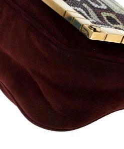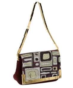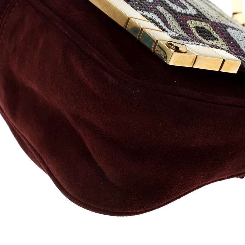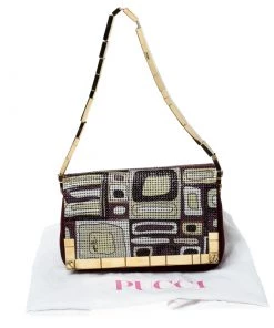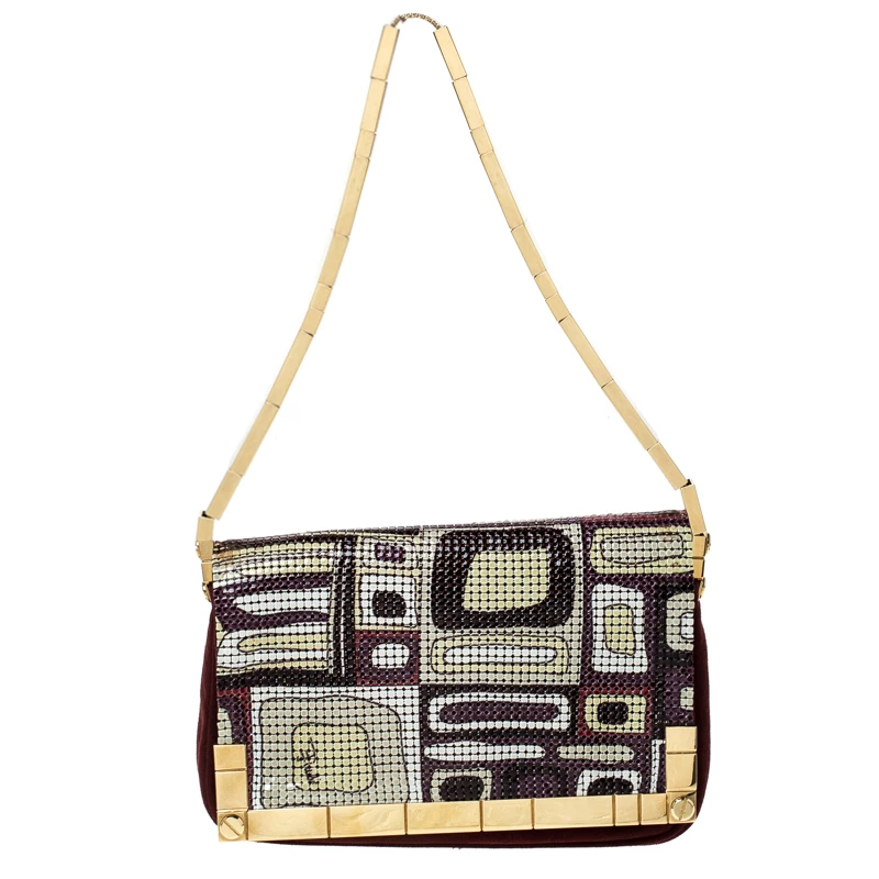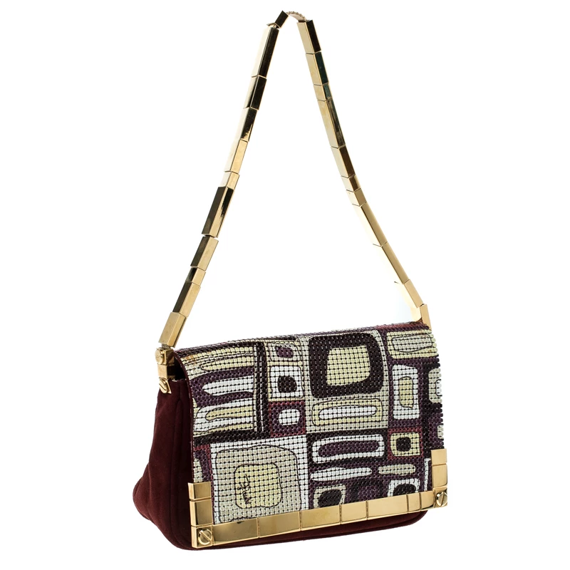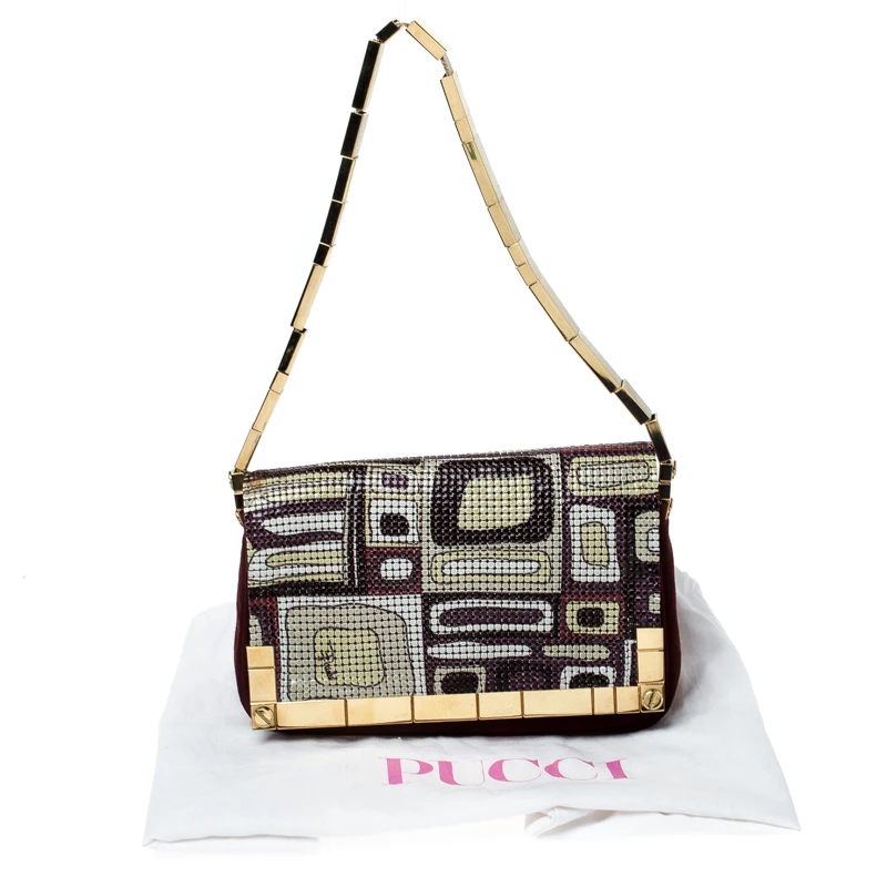 Charm your way through every gathering by swinging this flap bag from Emilio Pucci. Crafted from suede, the bag comes with a flap rendered in multicolored mesh featuring an interesting design and gold-tone metal-armored edges. It carries a spacious interior that will easily hold all your essentials and the bag is complete with a metal shoulder strap.