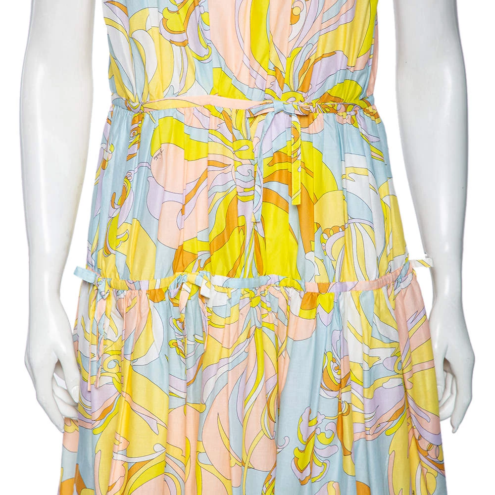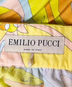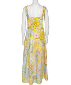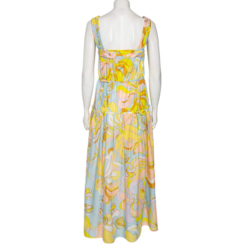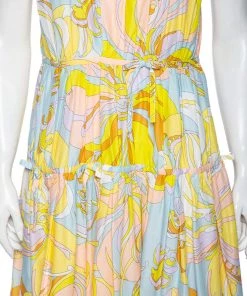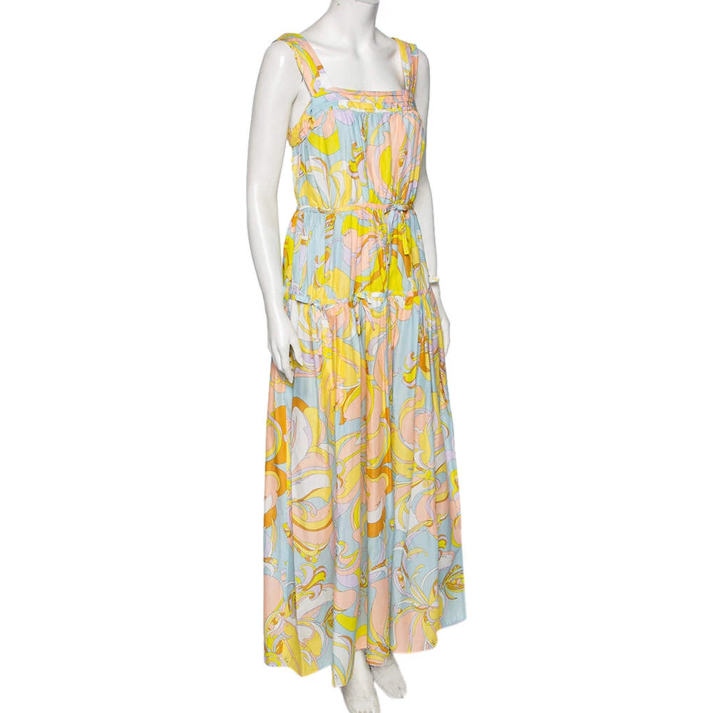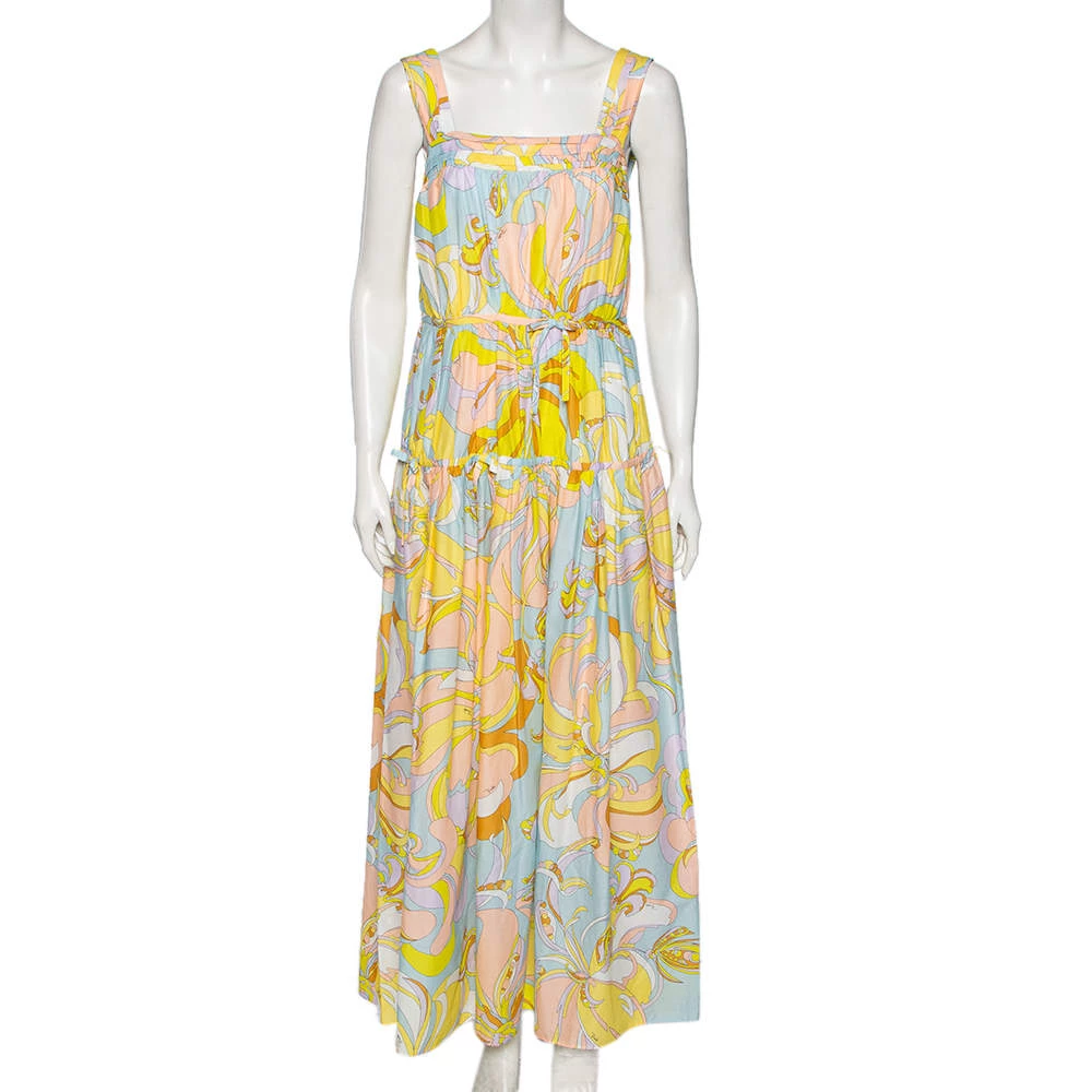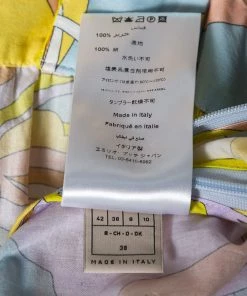 Emilio Pucci’s designs will forever leave an imprint on your mind. One such impeccable design is this dress. This dress from Emilio Pucci is beautifully tailored using multicolored Aruba printed silk and shows a sleeveless style. For fastening, it has a zipper. Make a chic statement as you don this beauty!
