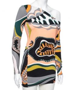 Prints in varying colors and an asymmetric neckline draw out the charm of this Emilio Pucci top. It is made of high-quality materials to give you all-day comfort.