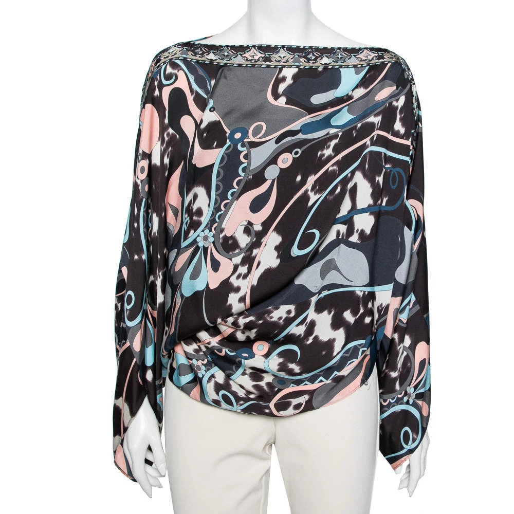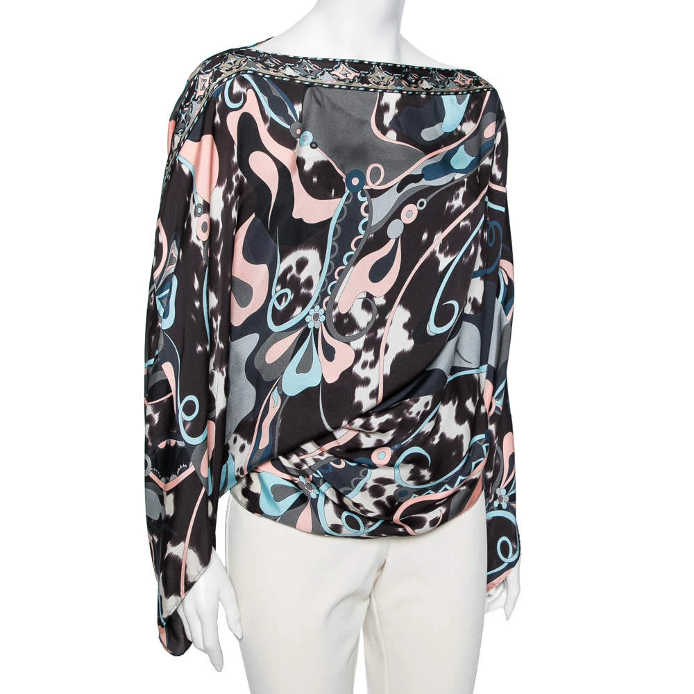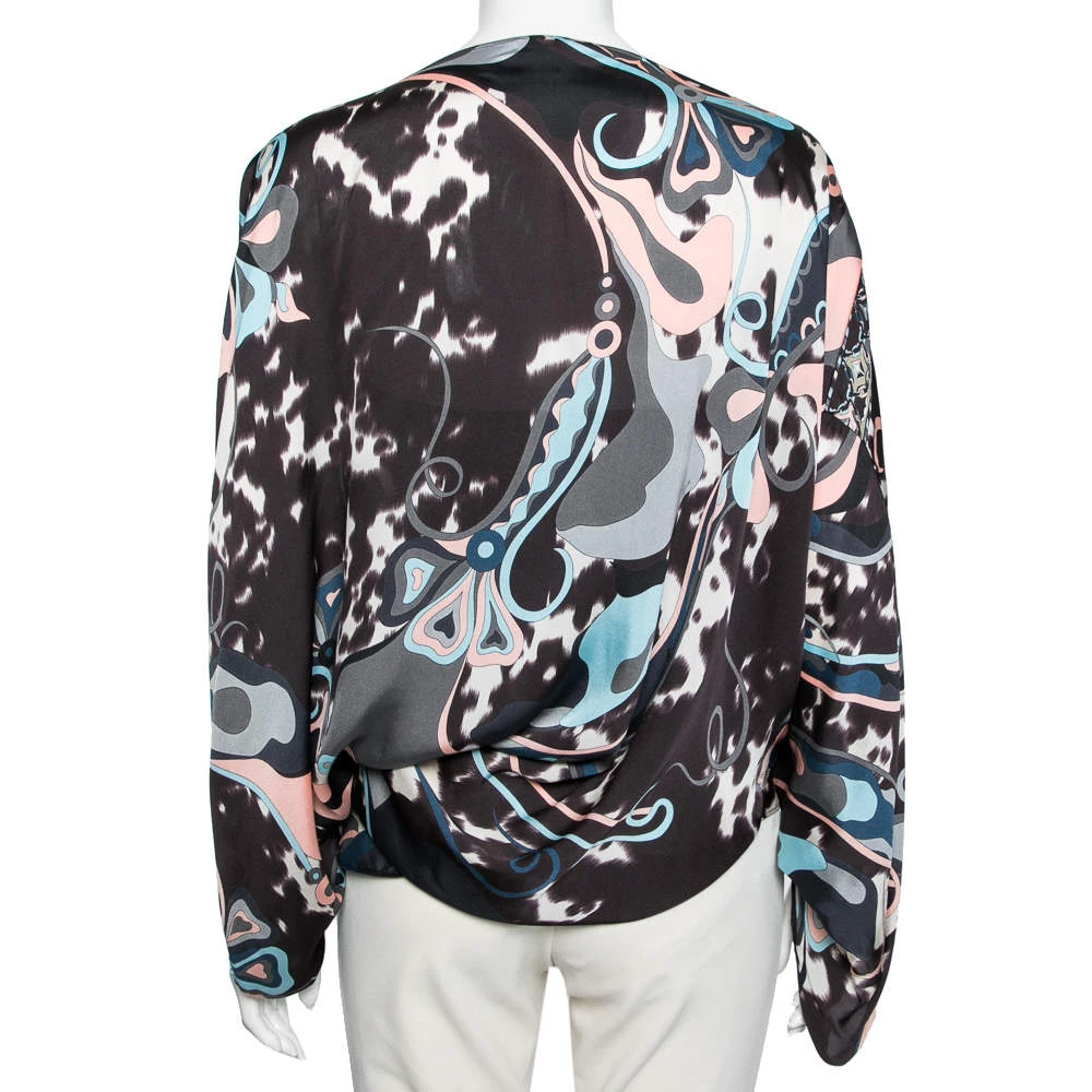 Emilio Pucci adds color and fun to your closet with this beautifully-made blouse. It is tailored using multicolored printed silk fabric and flaunts an asymmetrical draped detailing. It is provided with a buttoned closure.