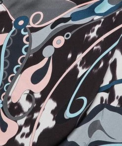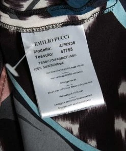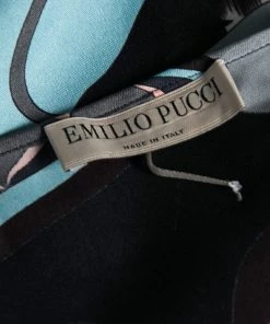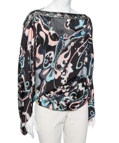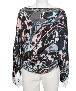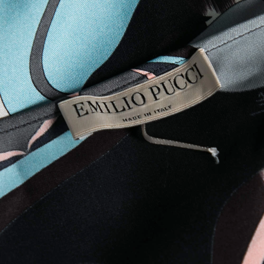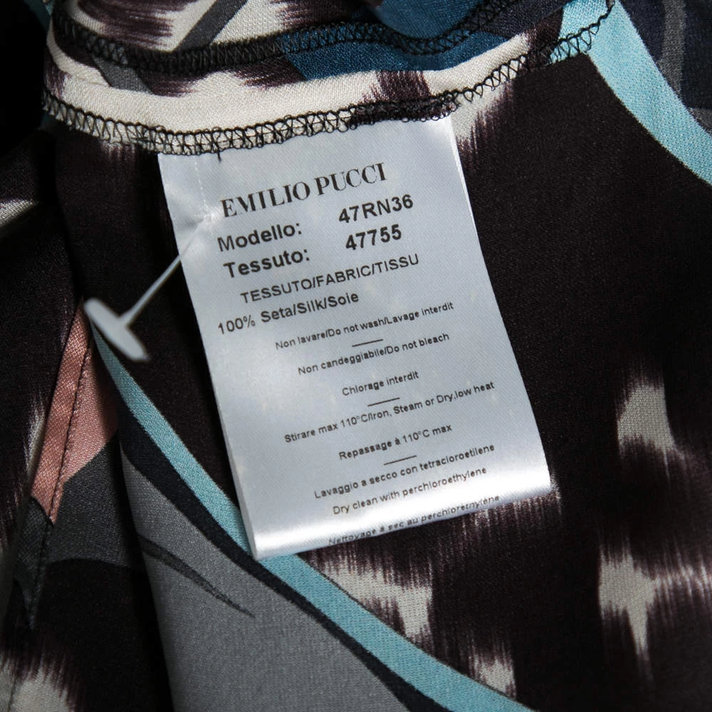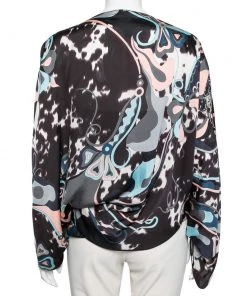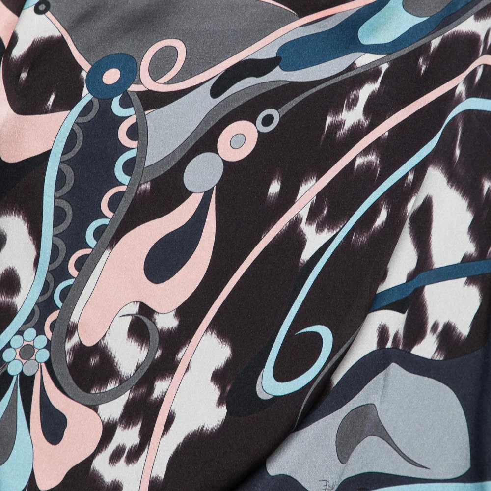 Emilio Pucci adds color and fun to your closet with this beautifully-made blouse. It is tailored using multicolored printed silk fabric and flaunts an asymmetrical draped detailing. It is provided with a buttoned closure.