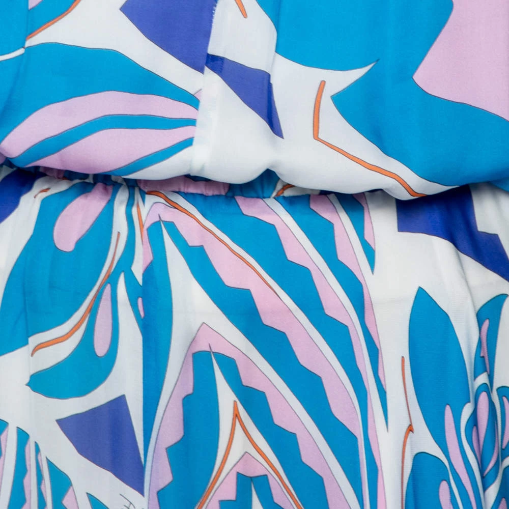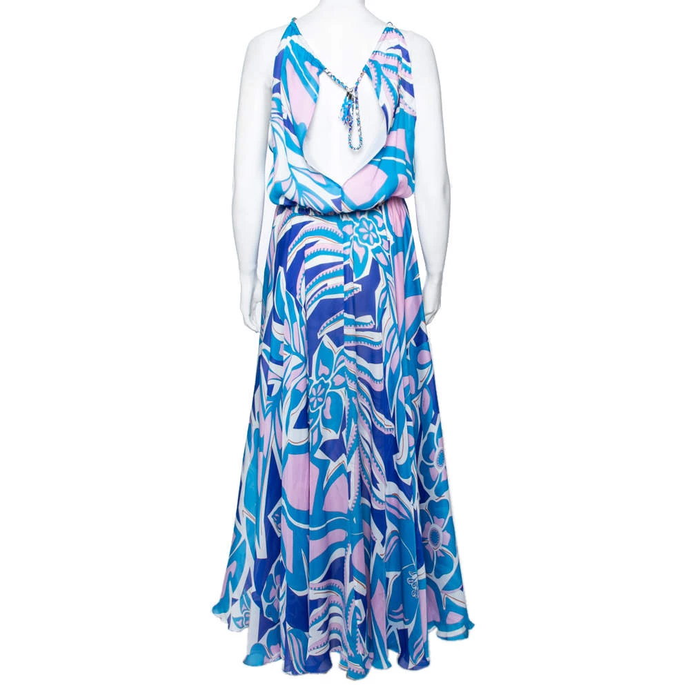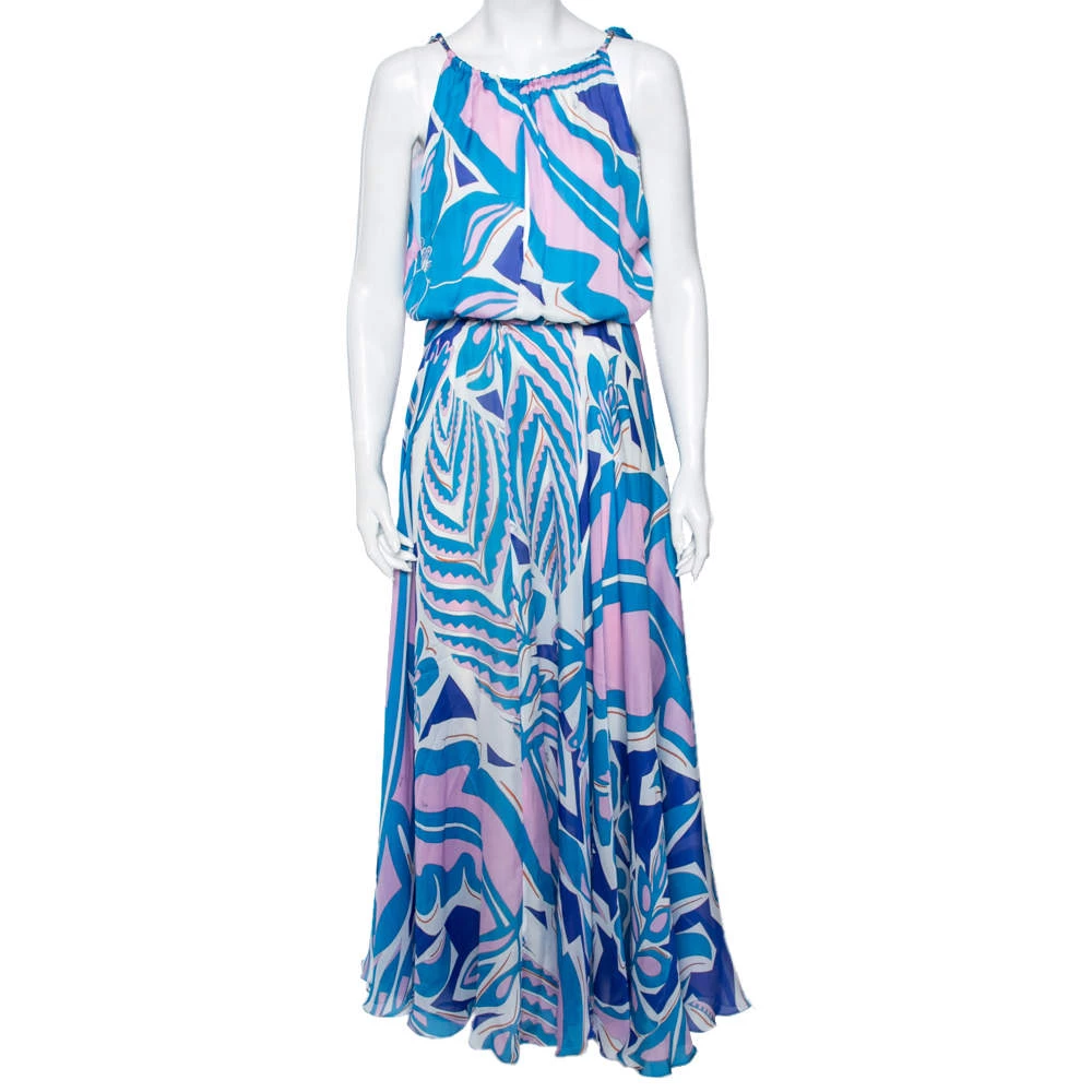 Emilio Pucci’s designs will forever leave an imprint on your mind. One such impeccable design is this lovely maxi dress that has been made from silk and flaunts a beautiful multicolored print all over with a stylish back. It is sleeveless and has a gathered detail with a flowy silhouette.
