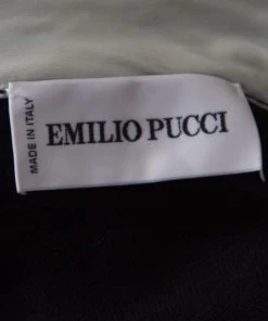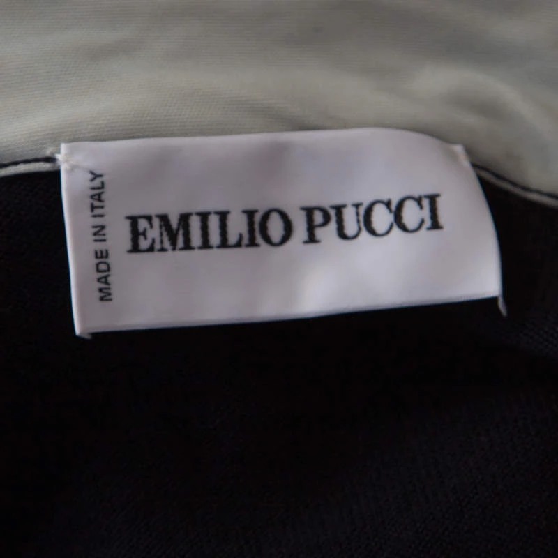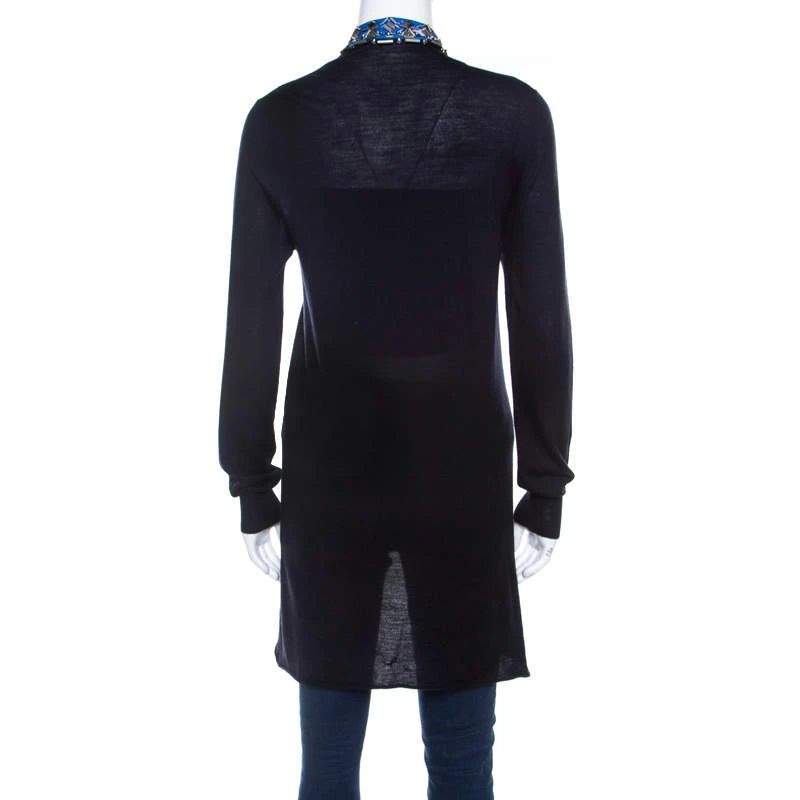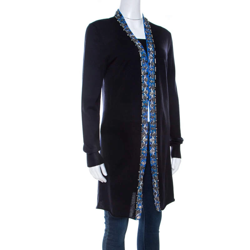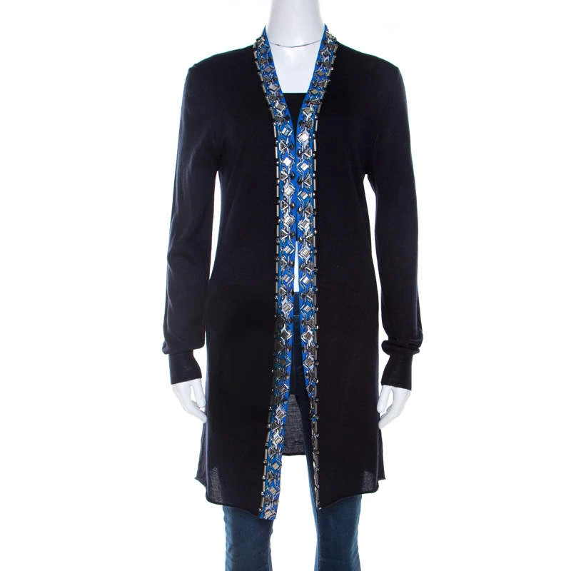Modishly designed with a feminine approach, this Emilio Pucci cardigan features a navy blue hue and embellished trims at the front. This snug cardigan has an open front with long sleeves. Layer this over your casual as well as evening separates to complete the look.