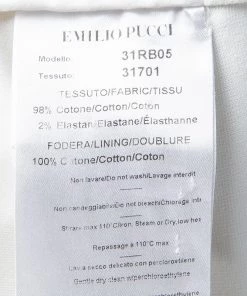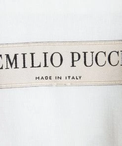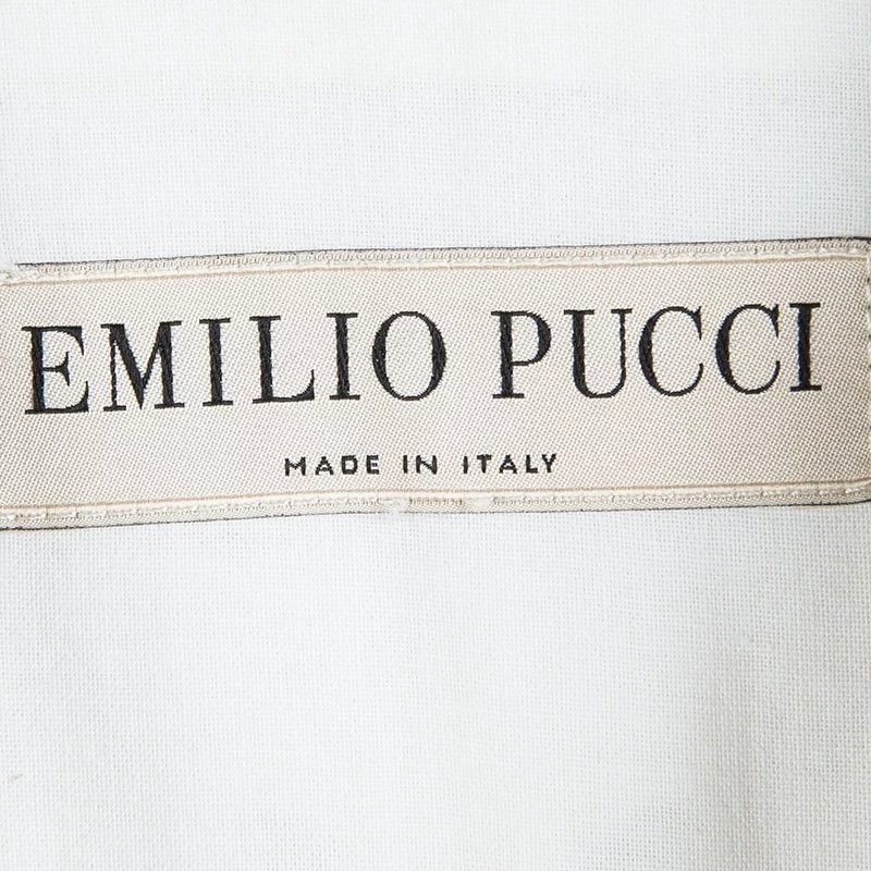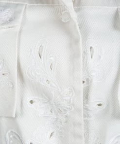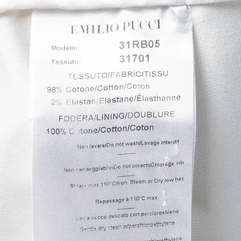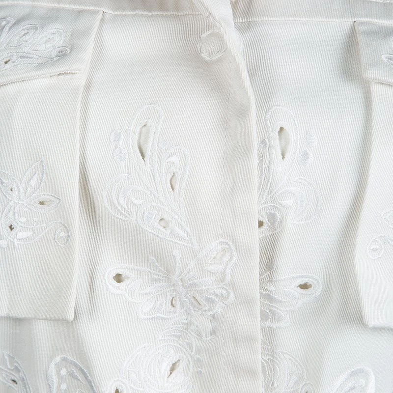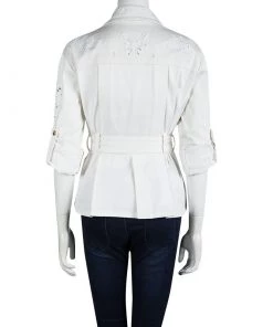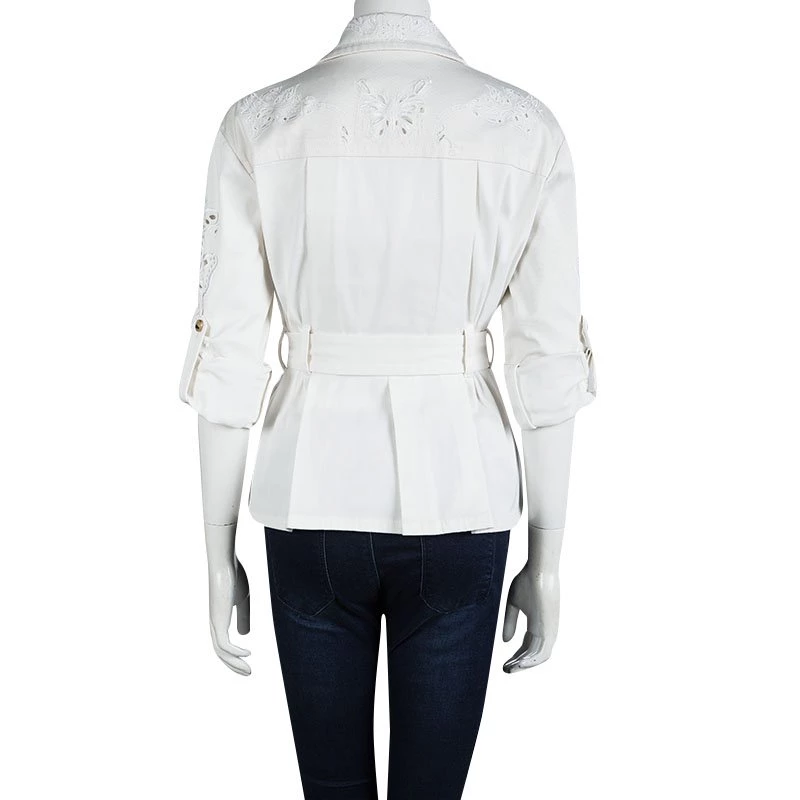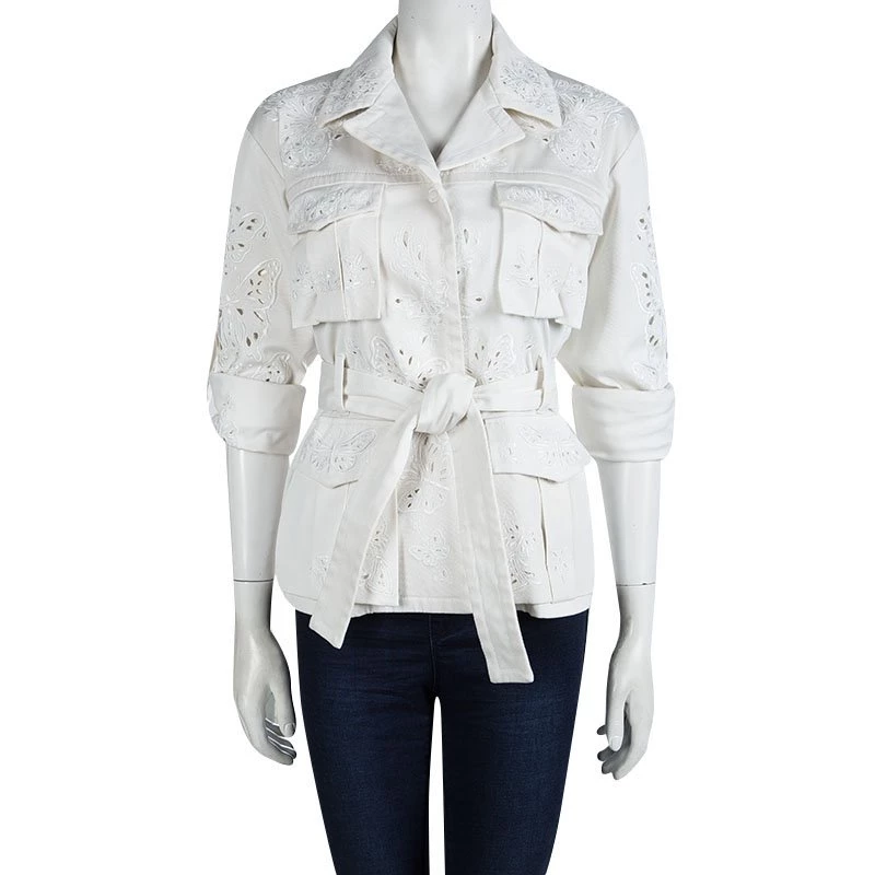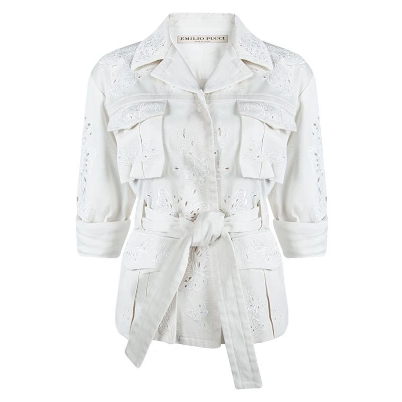 Add a touch of elegance and style to your wardrobe with this beautiful off white jacket from the house of Emilio Pucci. Made from cotton, this jacket has four front pockets and has stunning butterfly embroidery all over. With camouflaged buttons, the tie up strap around the waist adds to the elegance of the jacket.