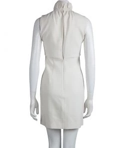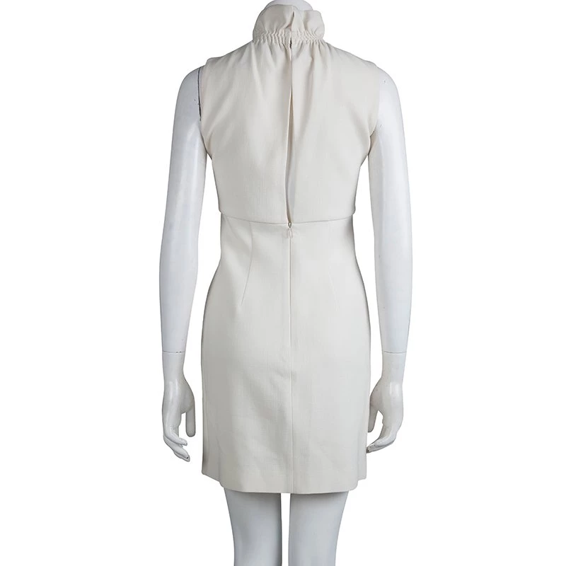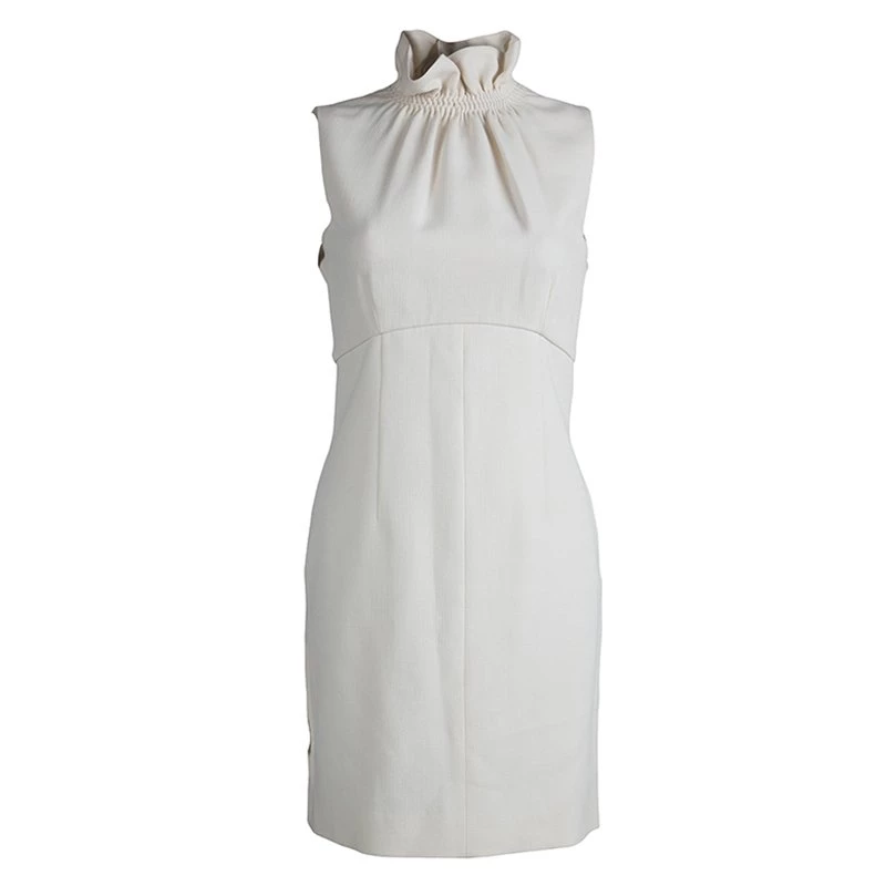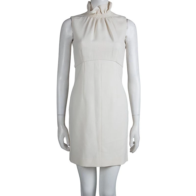 This sleeveless wool dress drapes effortlessly thanks to the ruched neckline. Not only does this define a frill at the neck, the gathers also widen out at the shoulder doing away with awkward creases at the armholes. This Emilio Pucci creation is a cocktail dress that combines simplicity and style.