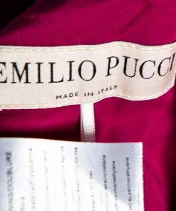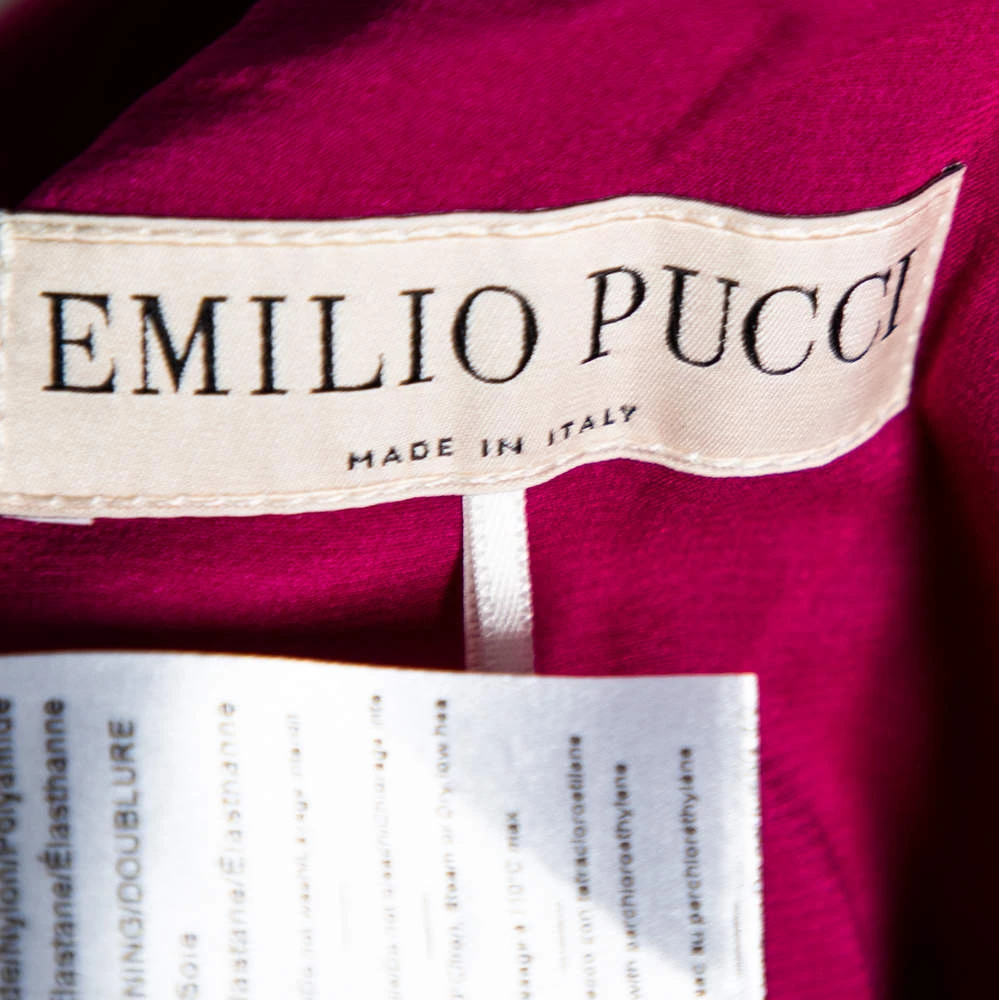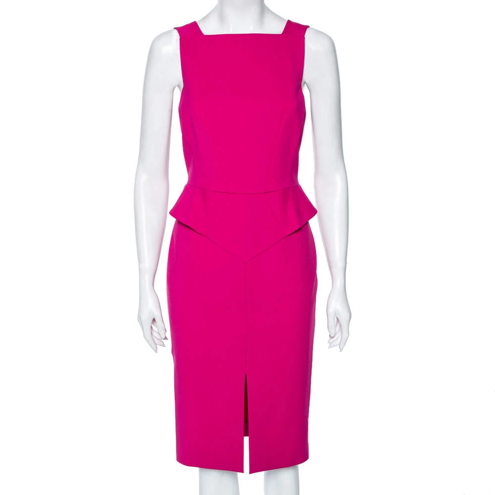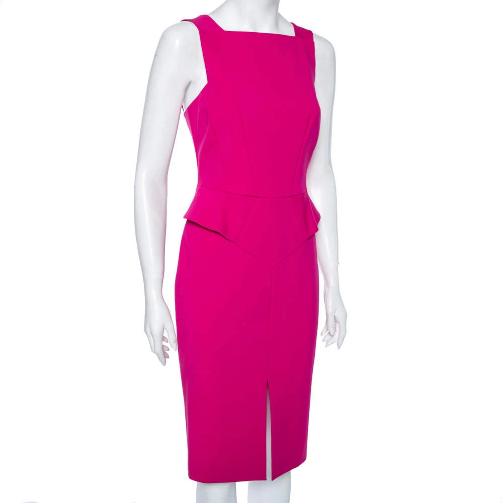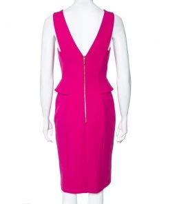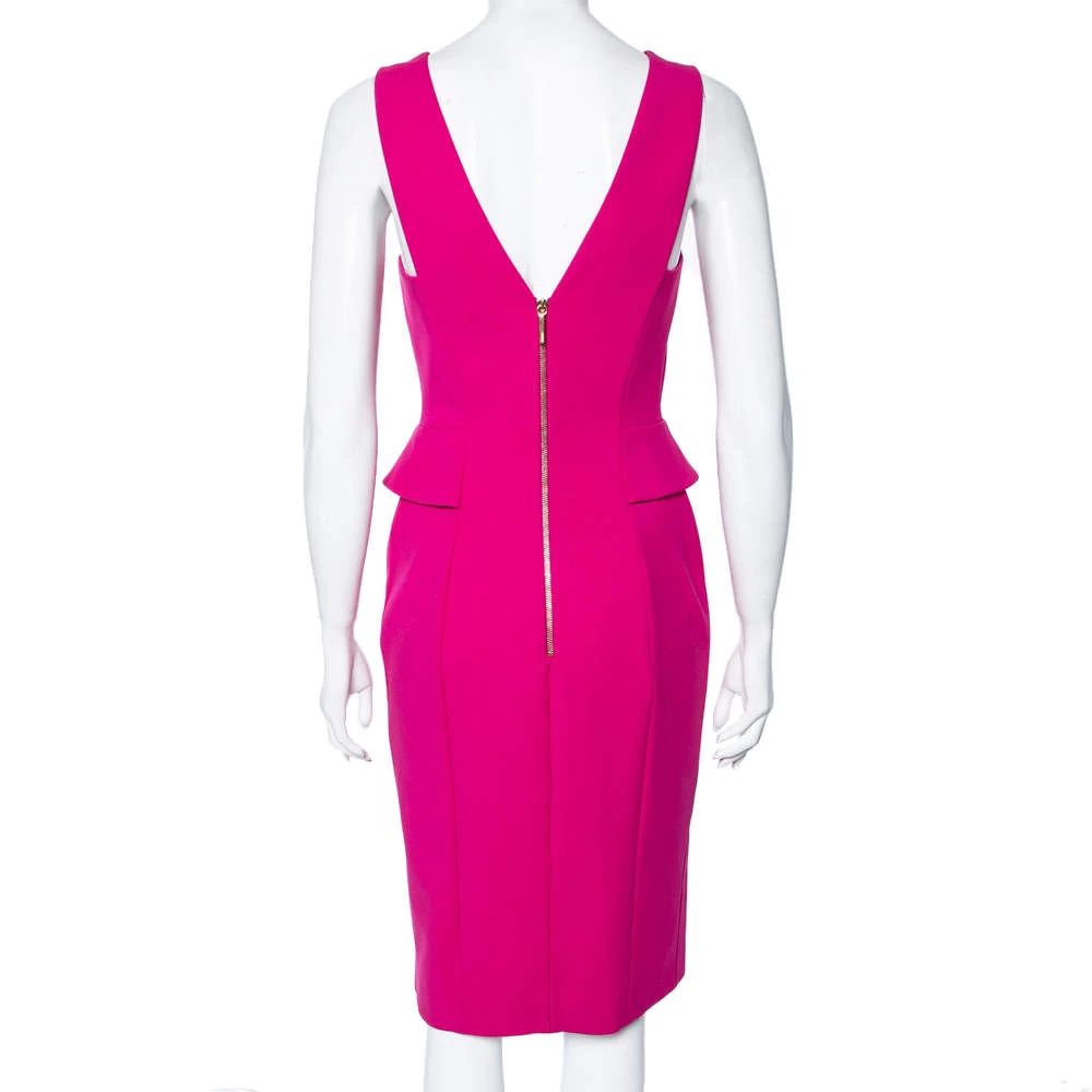 Make a style statement in this beautiful sheath dress from Emilio Pucci. Showcasing a pretty pink hue, it is sleeveless and has a peplum detailing at the waist. The deep V-neck at the back and the slight slit at the front hem lend a fashionable touch to this structured piece.