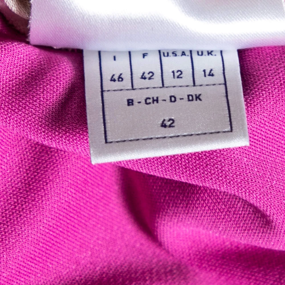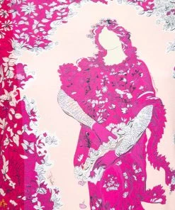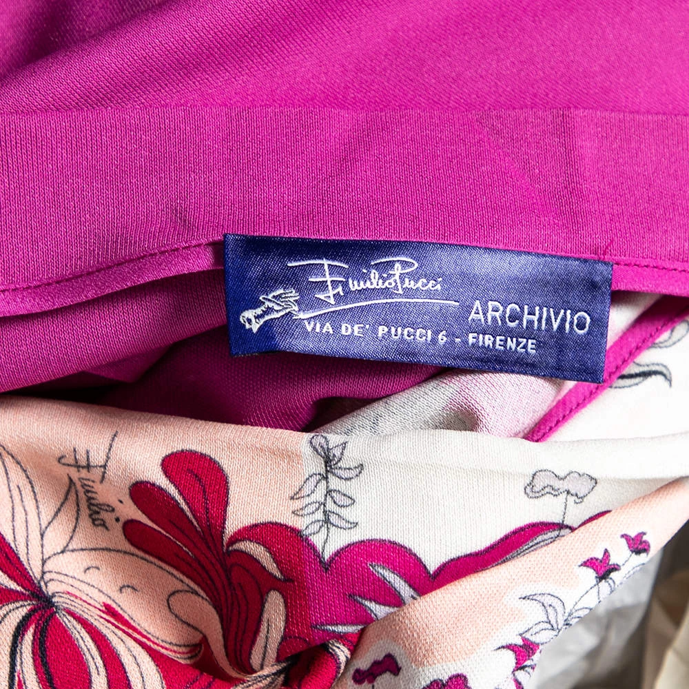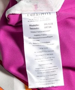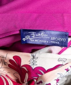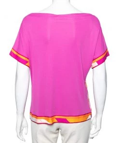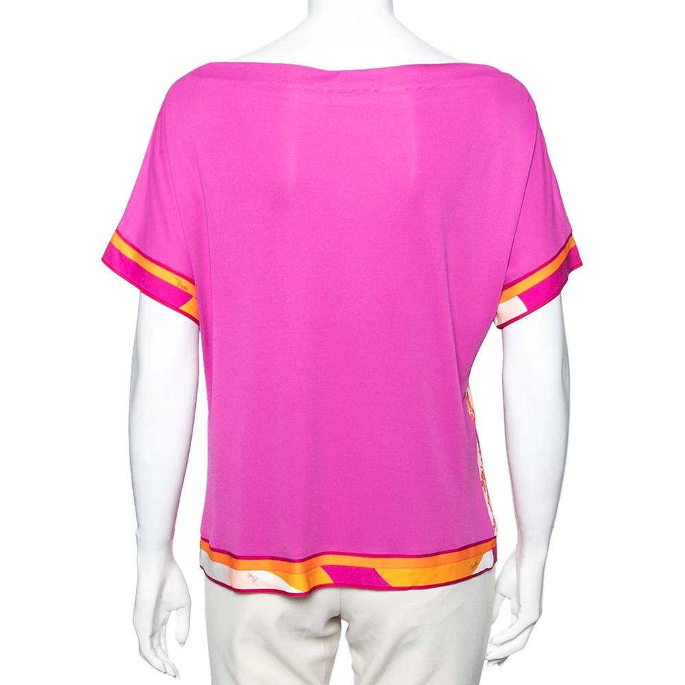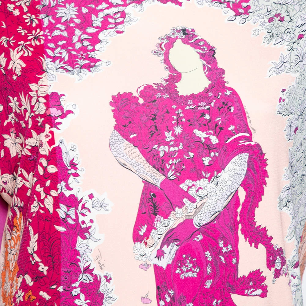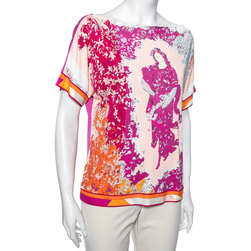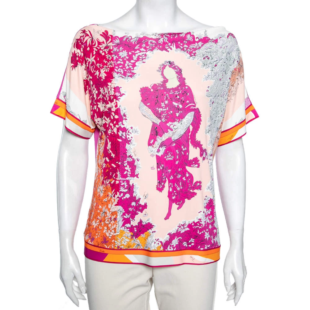 How beautiful is this blouse from Emilio Pucci! Tailored using pink stretch knit fabric, this blouse flaunts a floral and Lady print on the front. This blouse is completed with short sleeves. Add this Emilio Pucci creation to your collection today!