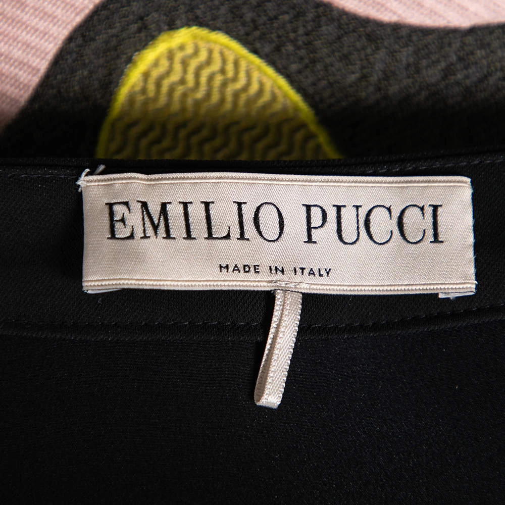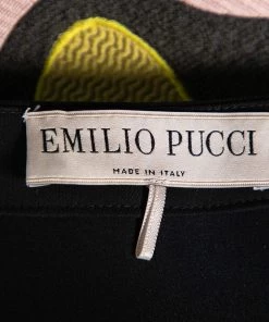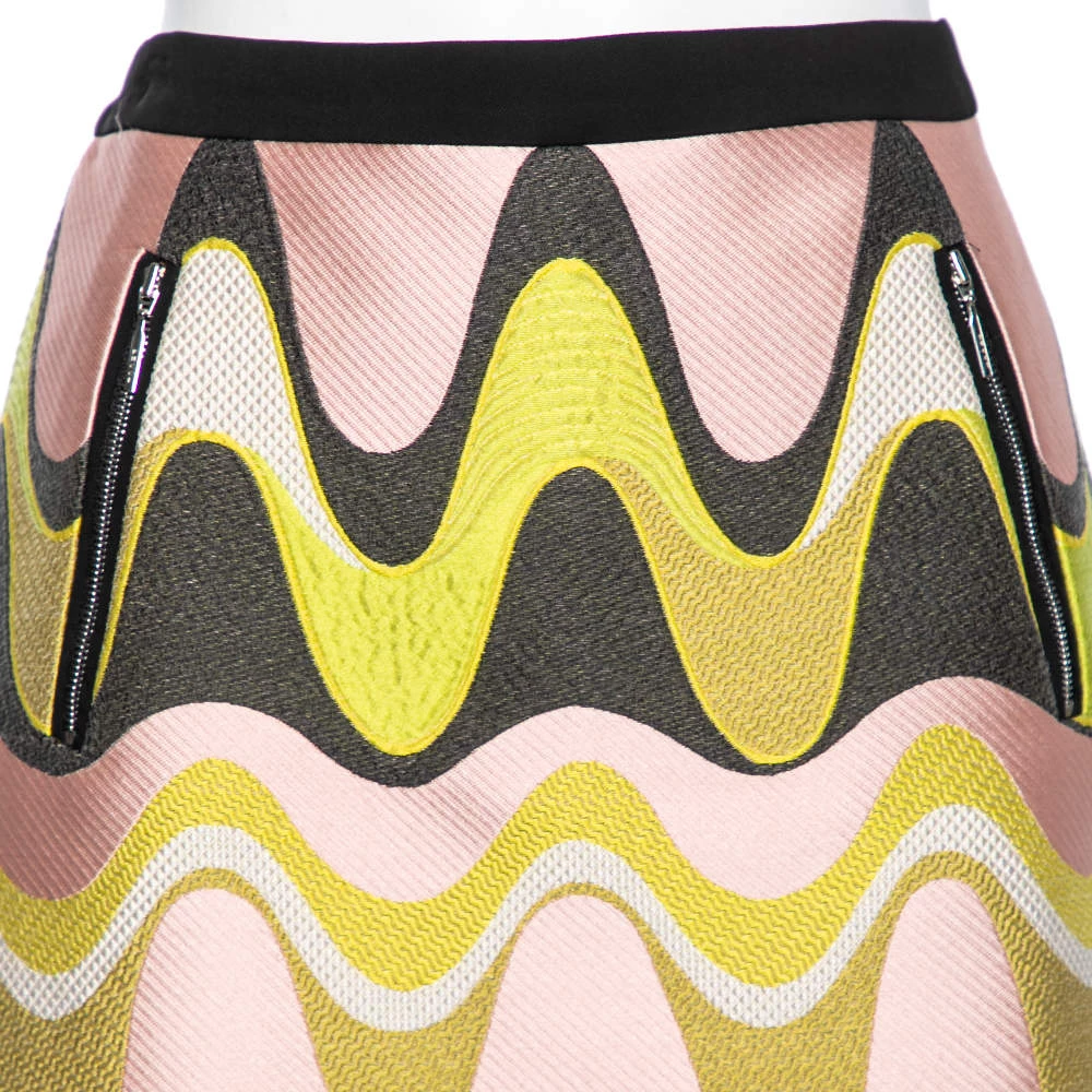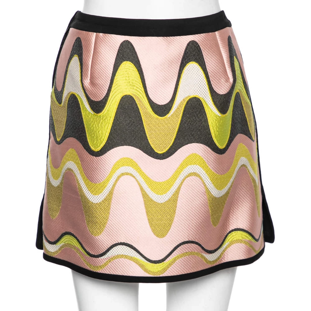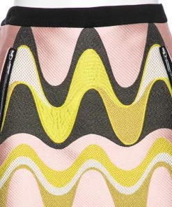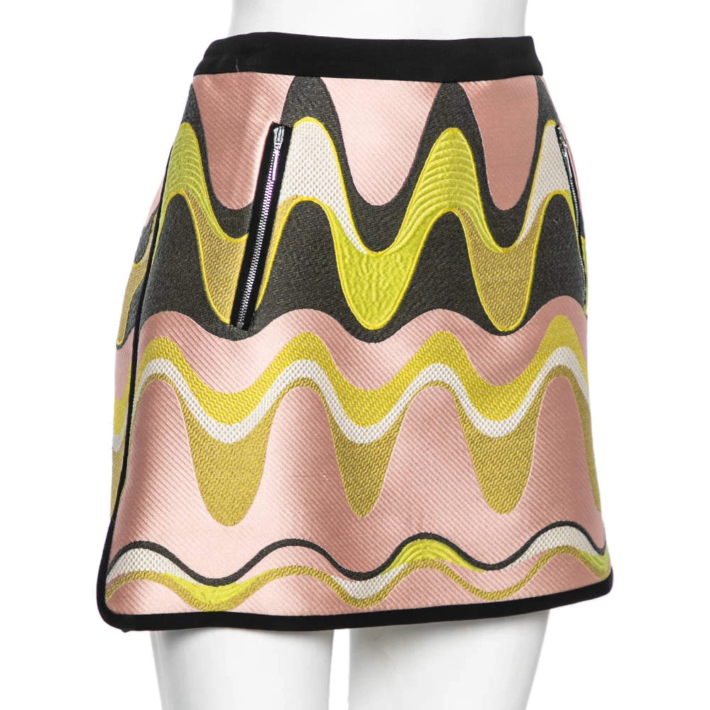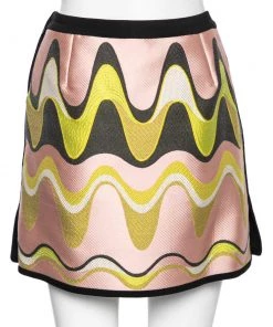 Emilio Pucci adds a bit of color and sparkle to your attire with this gorgeous short skirt. It is fashioned in pink-green wave jacquard fabric, which is highlighted with contrasting trims. It showcases a zip-type closure and two external pockets. Add this lovely skirt to your collection today!
