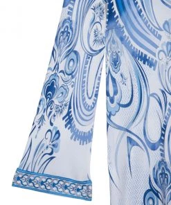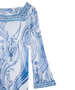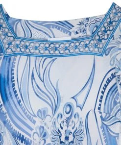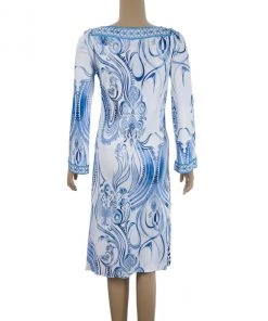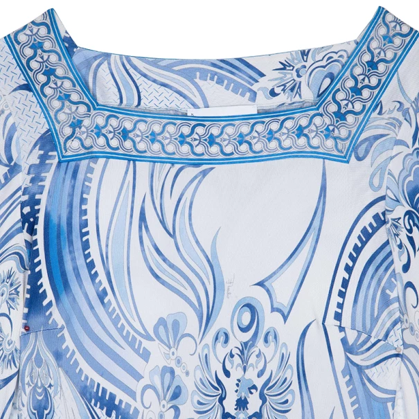 This Emilio Pucci dress is perfect for a breezy summer day outing. Made from viscose, its smooth texture is printed with blue and silver designs. This dress features cropped sleeves and a square neckline, outlined with chain-like design.