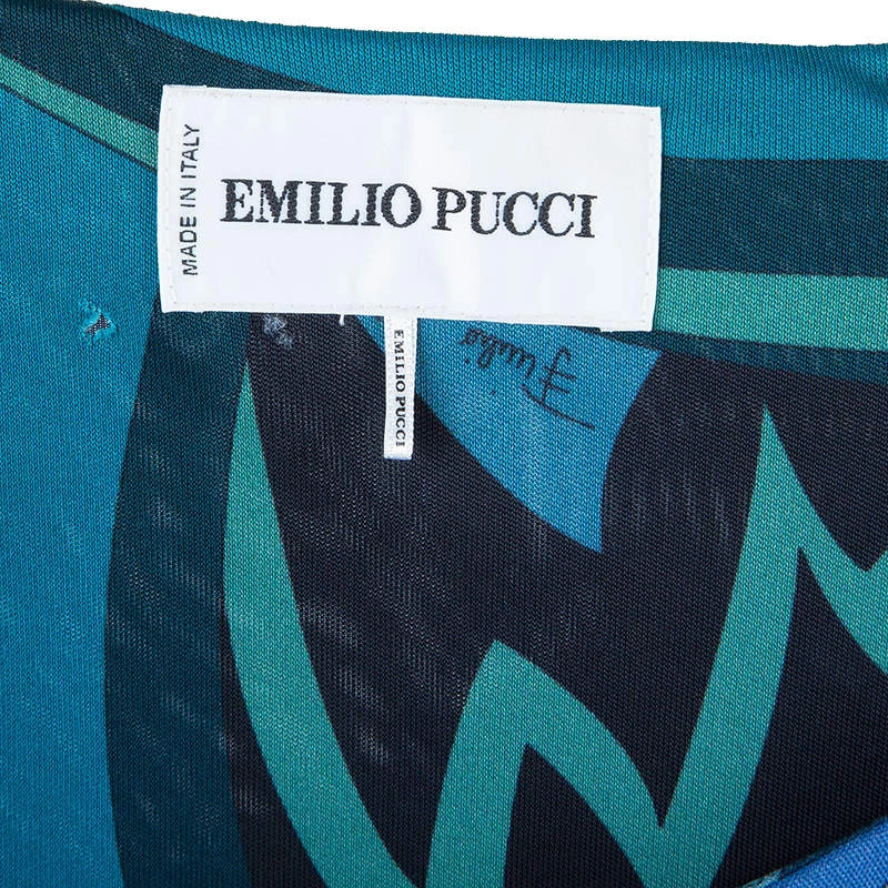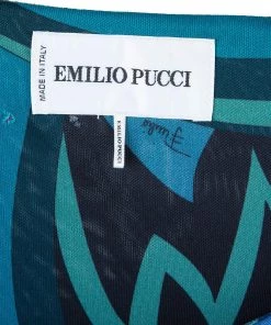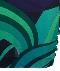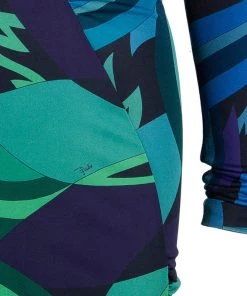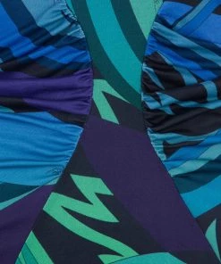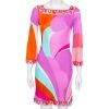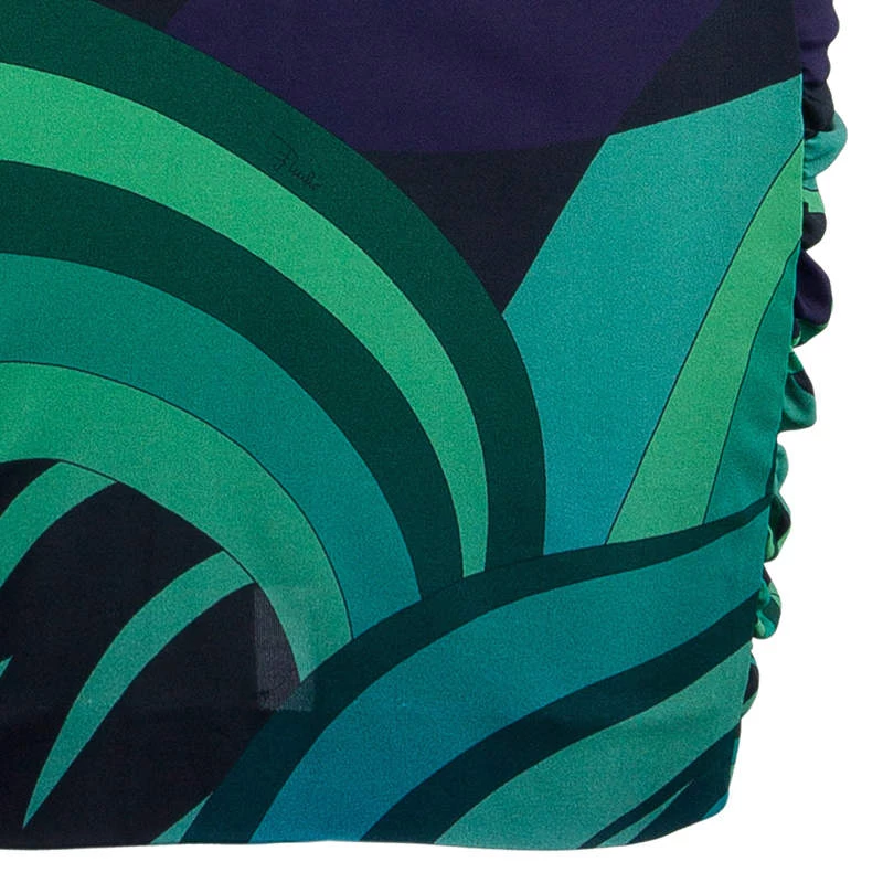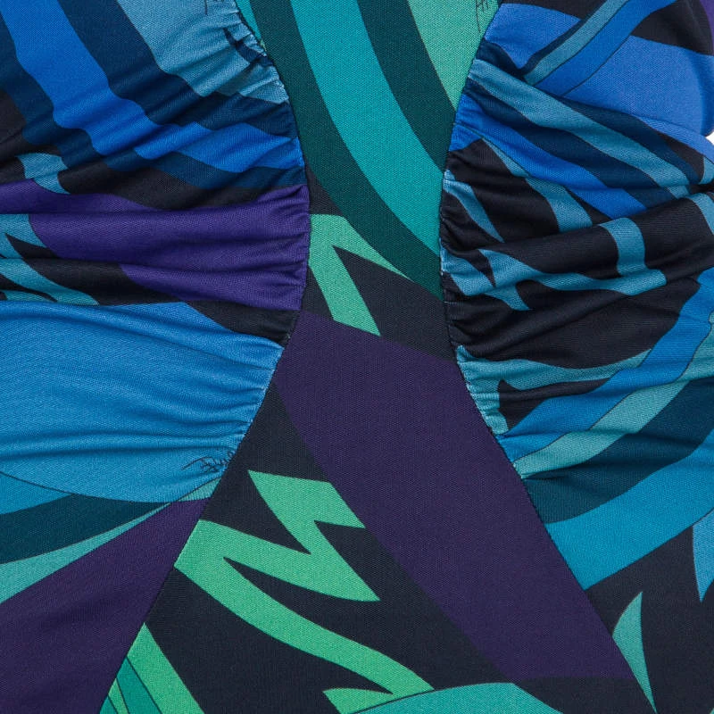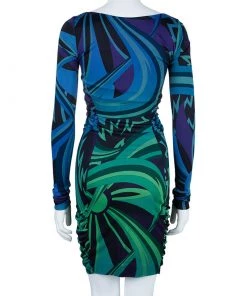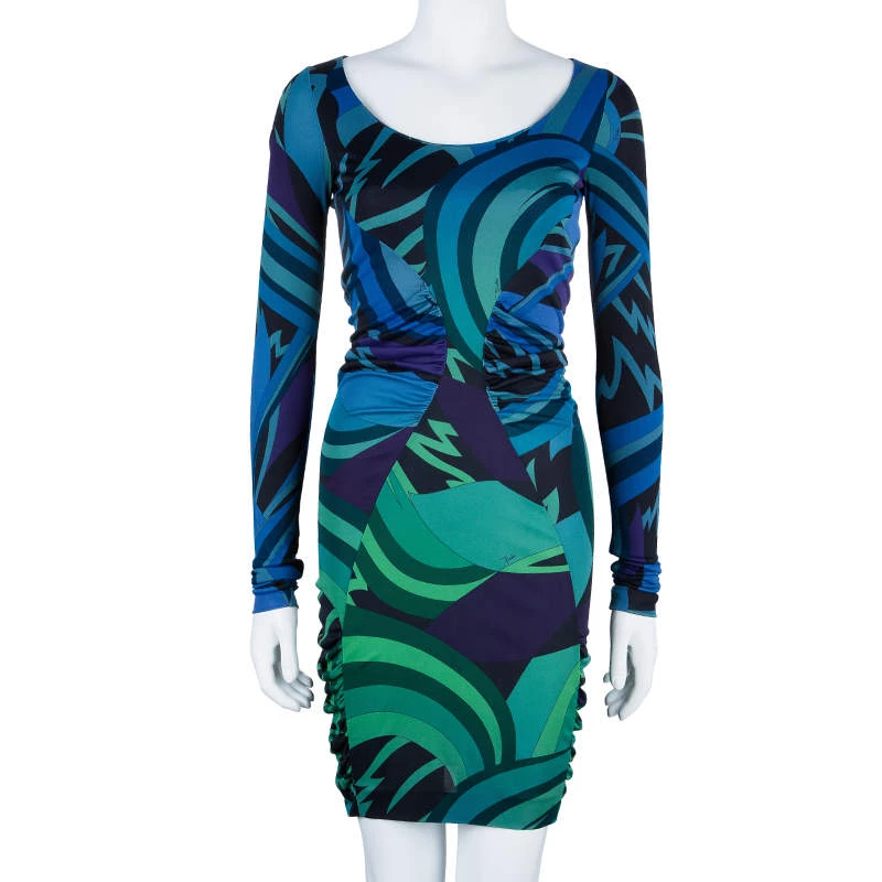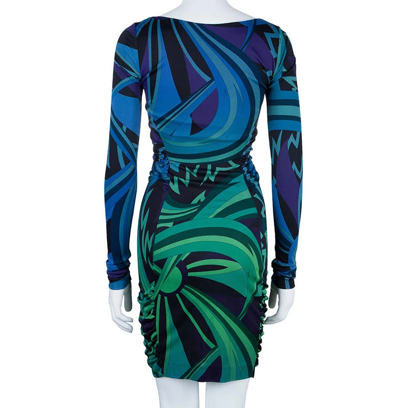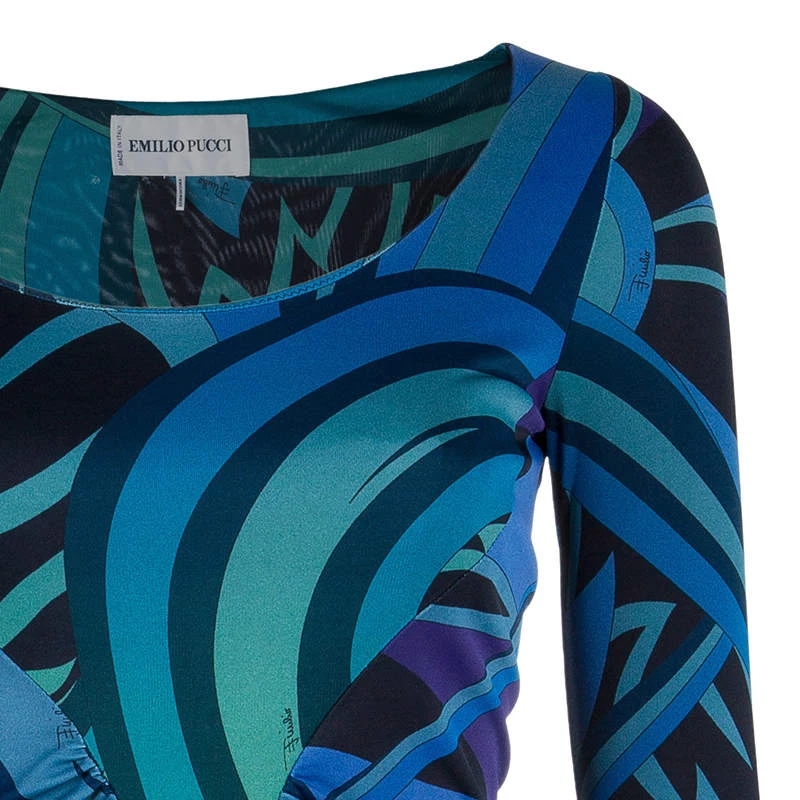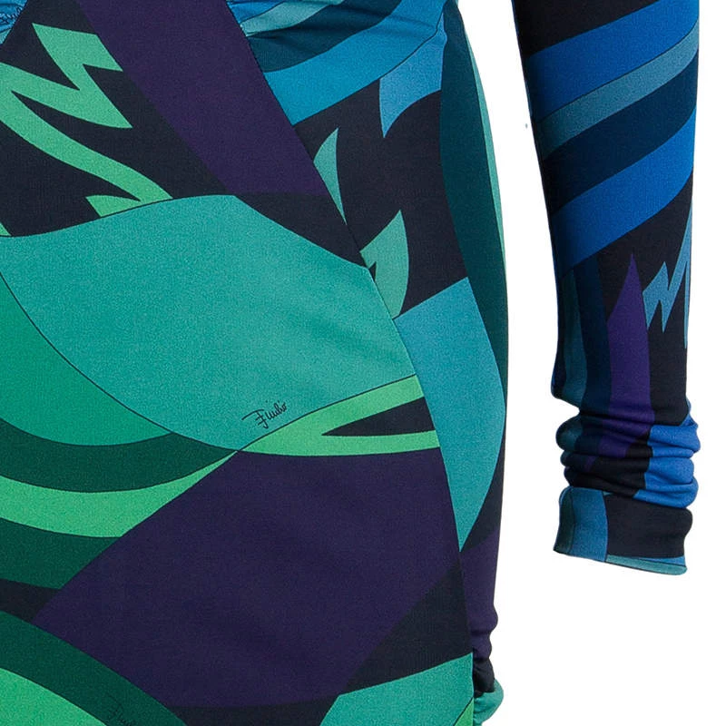 A cool abstract print gives an eye-catching style to this dress by Emilio Pucci. Tailored from pure viscose, it features fitted bodice featuring a round neckline, long sleeves with gathered details and ruched sides.