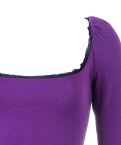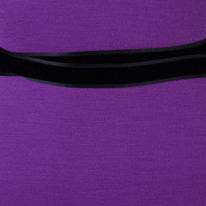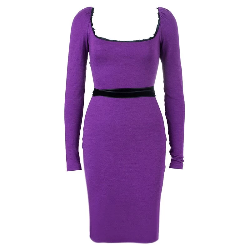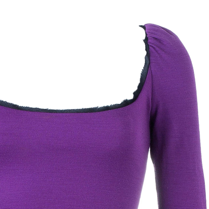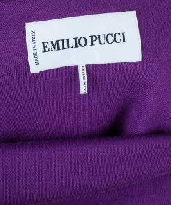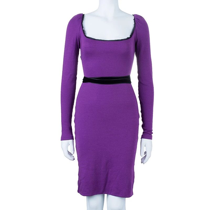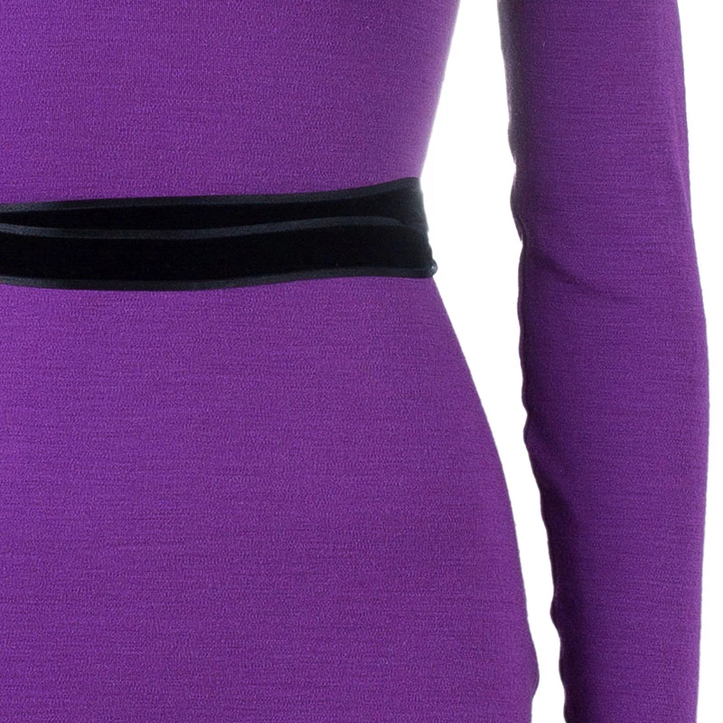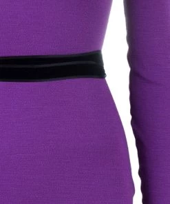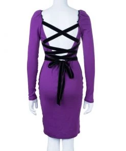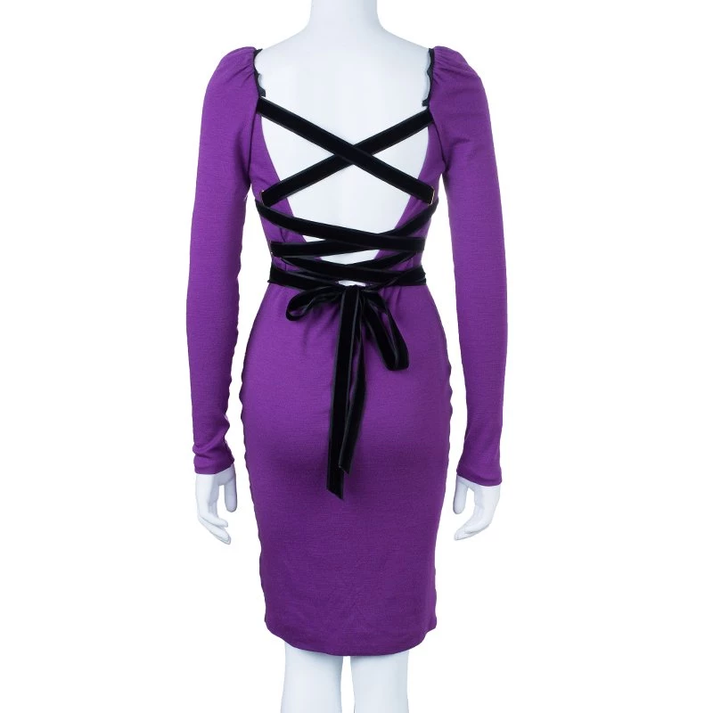 This astonishing backless tie-up dress by Emilio Pucci looks simply splendid in purple. Ideal for an evening gathering, the long sleeved dress features a black self tie sash and a black lining at the neck. The criss cross pattern of black straps at the back looks truly eye catching.