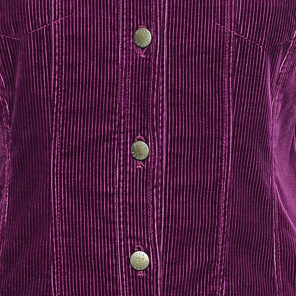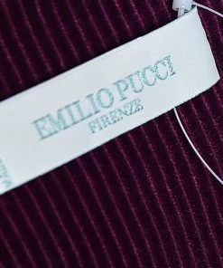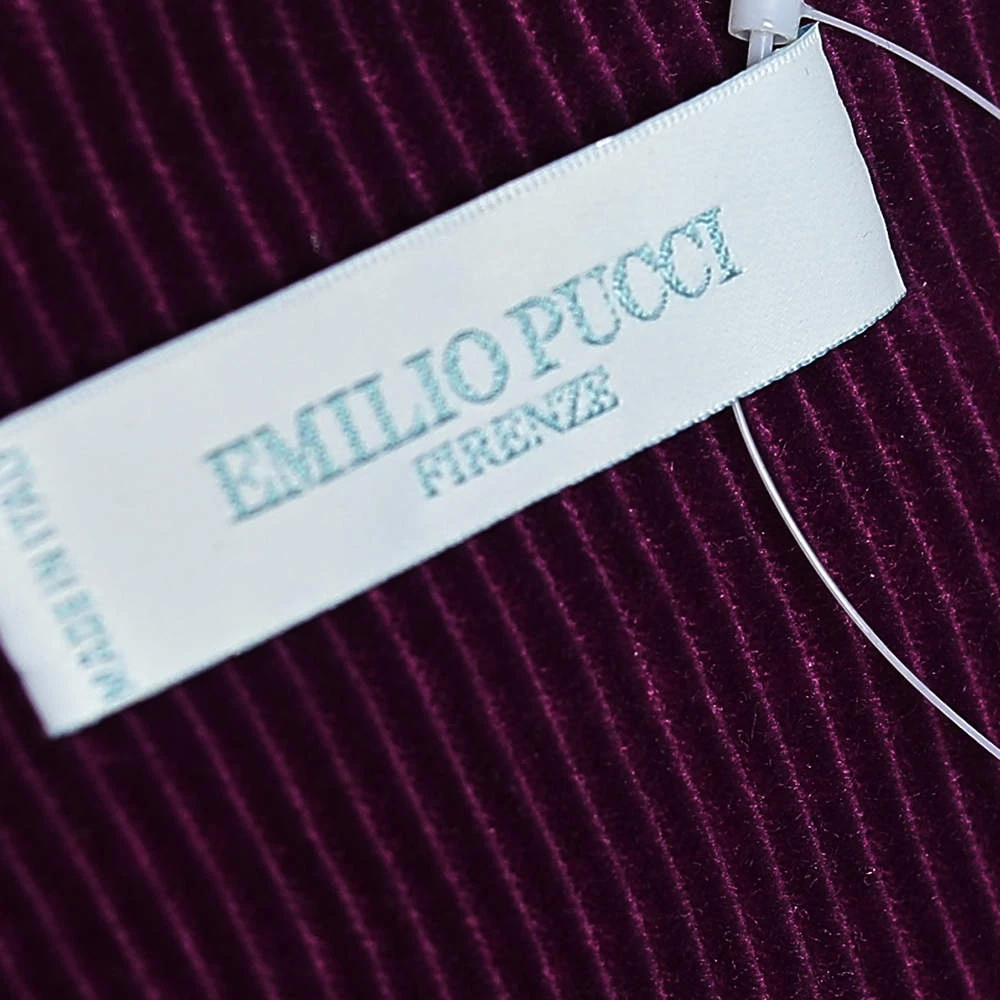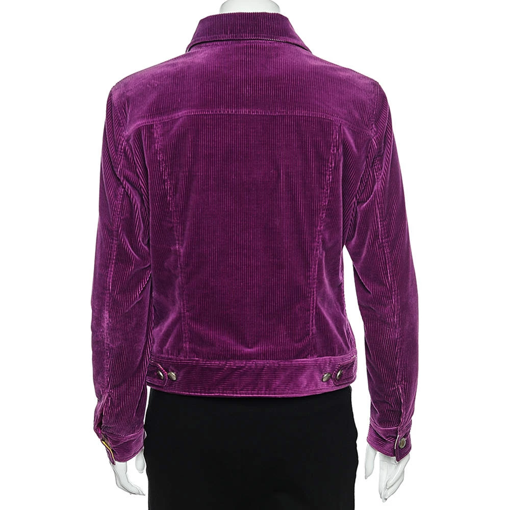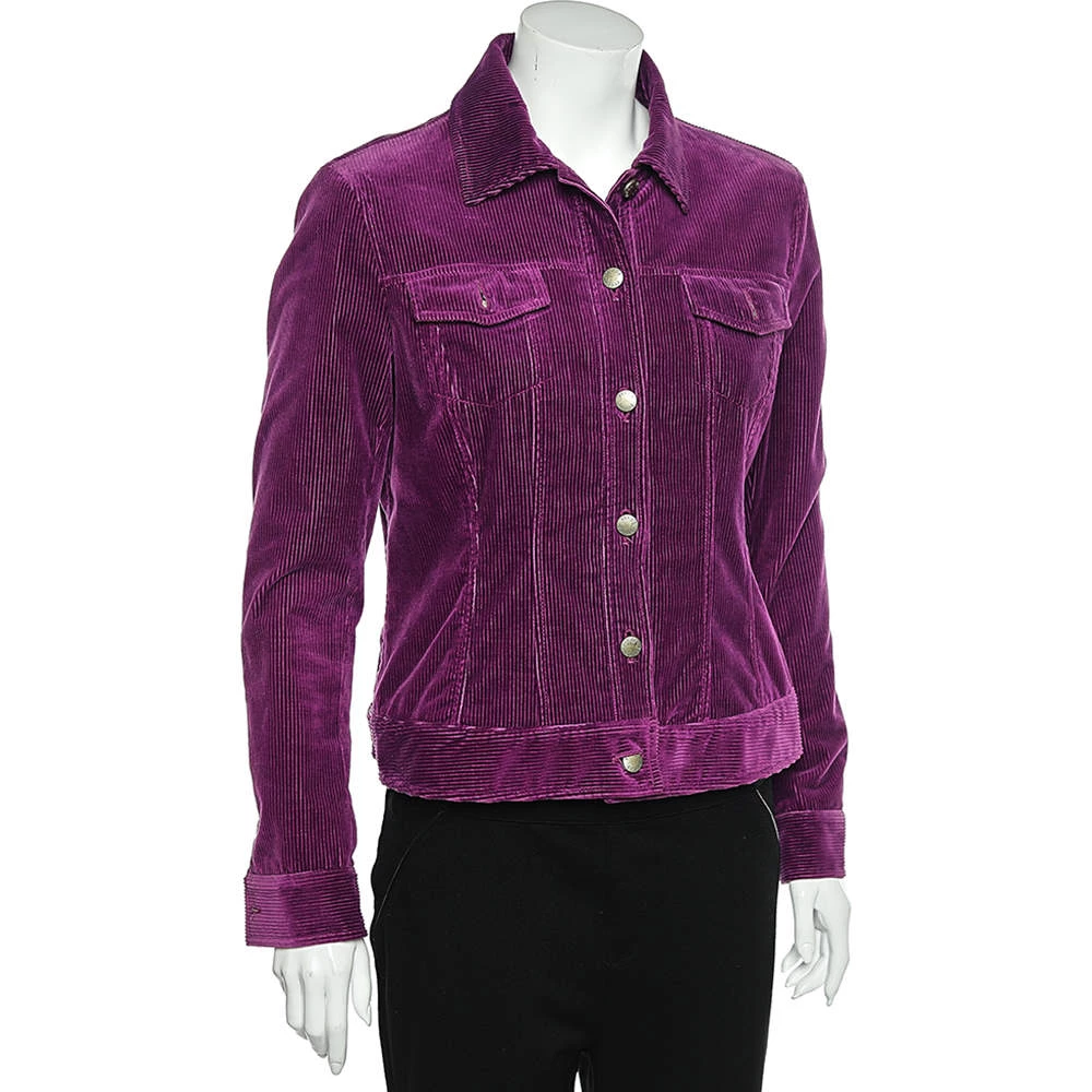 Add some color and uniqueness to your basic outfit by wearing this stunning jacket from the House of Emilio Pucci! It is luxuriously designed using purple corduroy fabric with a button-front feature elevating its appearance. It has long sleeves, buttoned cuffs, and two external pockets. Style it with black trousers and look polished!