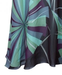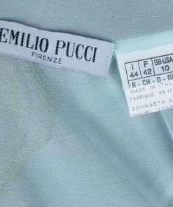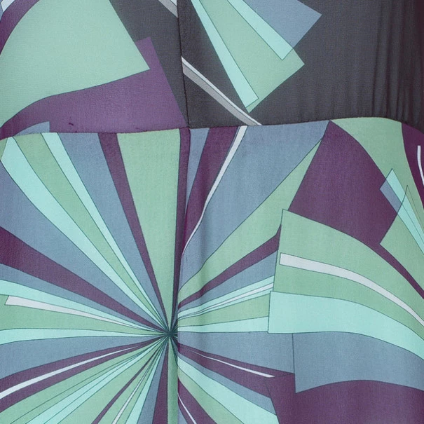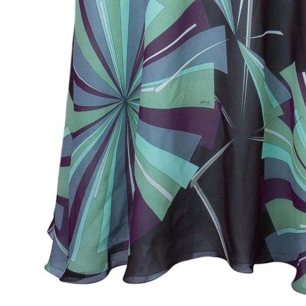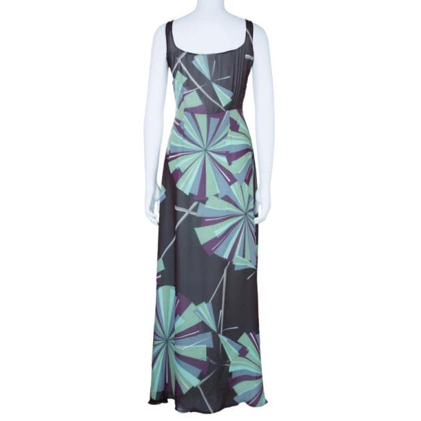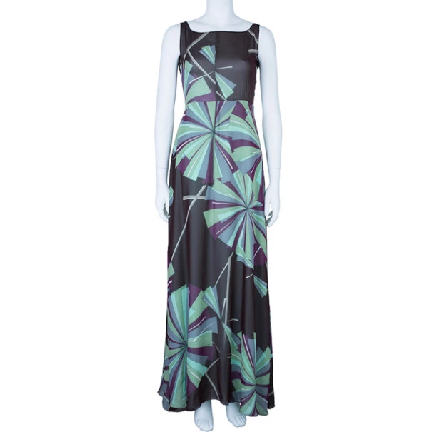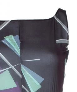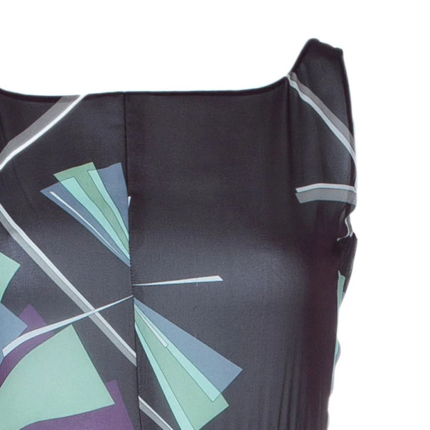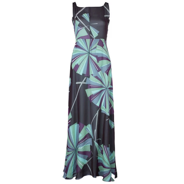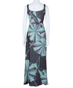 This gorgeous creation by Emilio Pucci is the perfect piece to add to your summer dress collection. It can be worn by the beach, throughout the day or on night events. It features a funky floral print in bright blue and purple colors while the rest of the dress is pure black silk. It also has no sleeves, a long skirt length and is nipped in under the bust area to accentuate your figure.