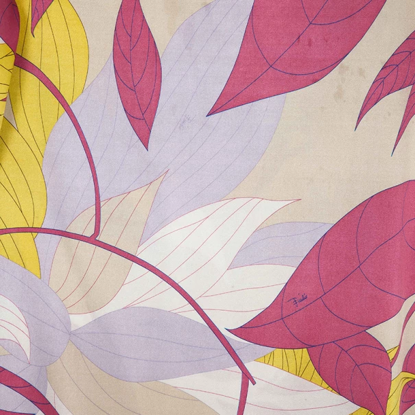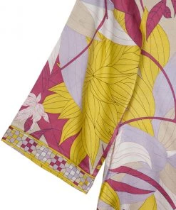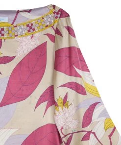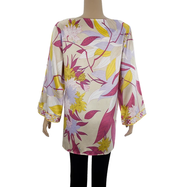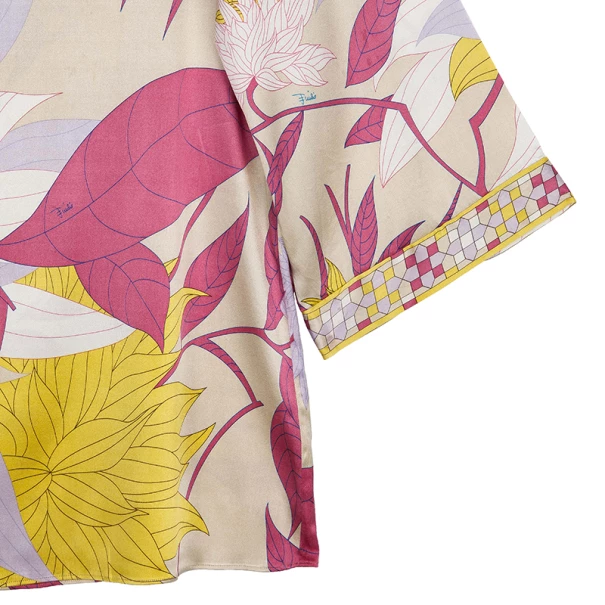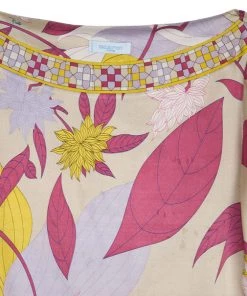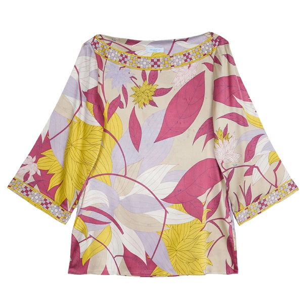 One of Emilio Pucci’s beautiful prints, this colorful smooth top is a summer essential. It features a boat neckline and wide sleeves with a checkered pattern outline to accent the print. With its multicolored leaf and flower combination, you can easily pair it up with accessories and pants from your closet.