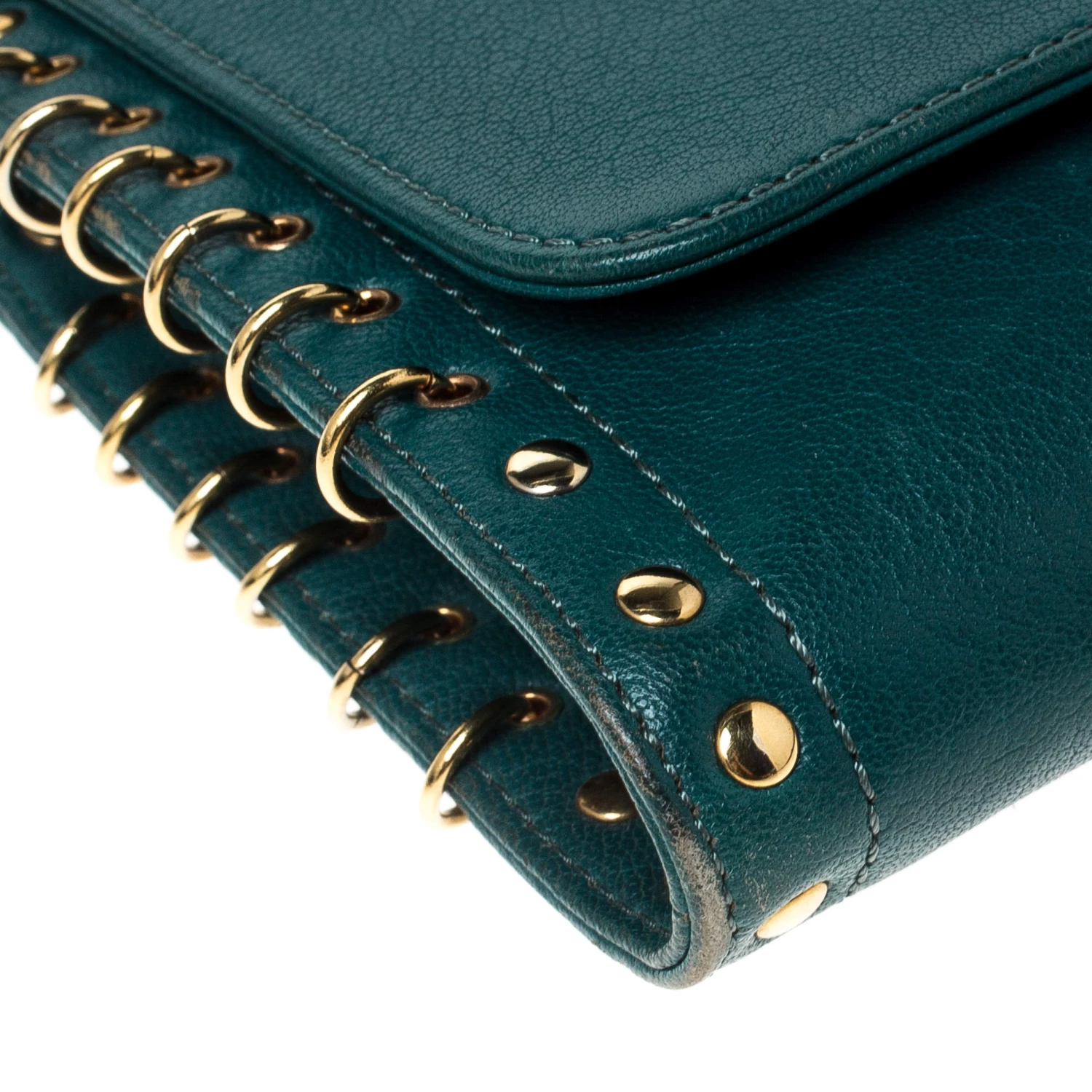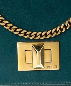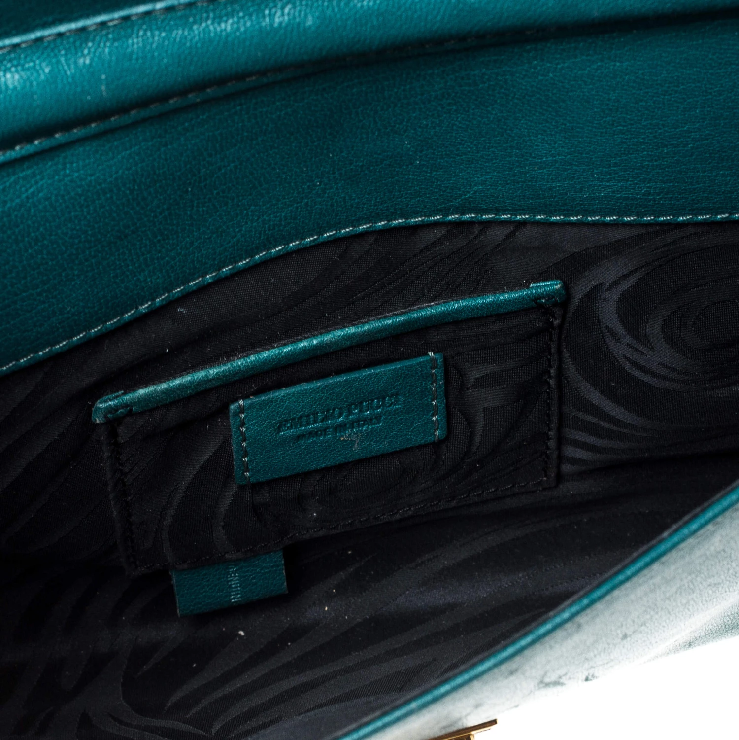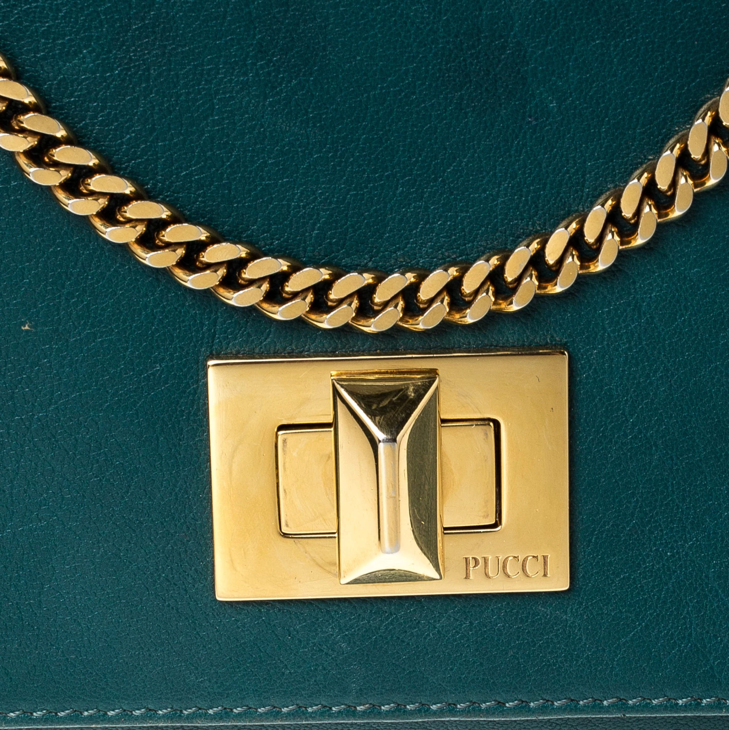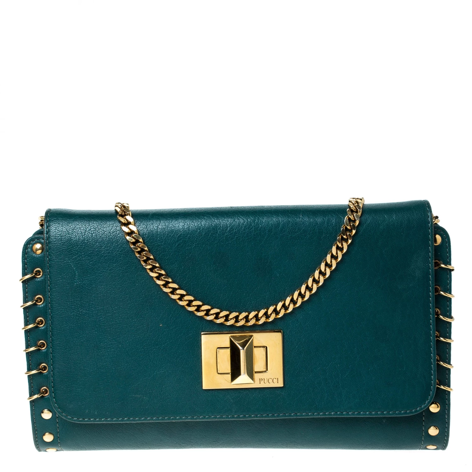 This turquoise number by Emilio Pucci is the perfect statement bag! The glorious color of the leather is complemented by classic gold-finish hardware and a long chain strap, so that one can wear it as a cross-body as well. The interior is lined with fabric and the flap is shut tight with a sleek lock closure that has an engraved logo.