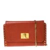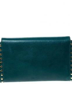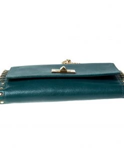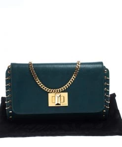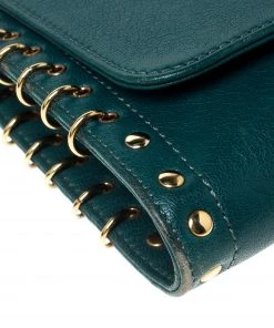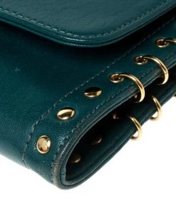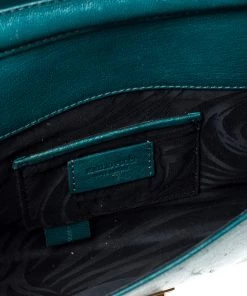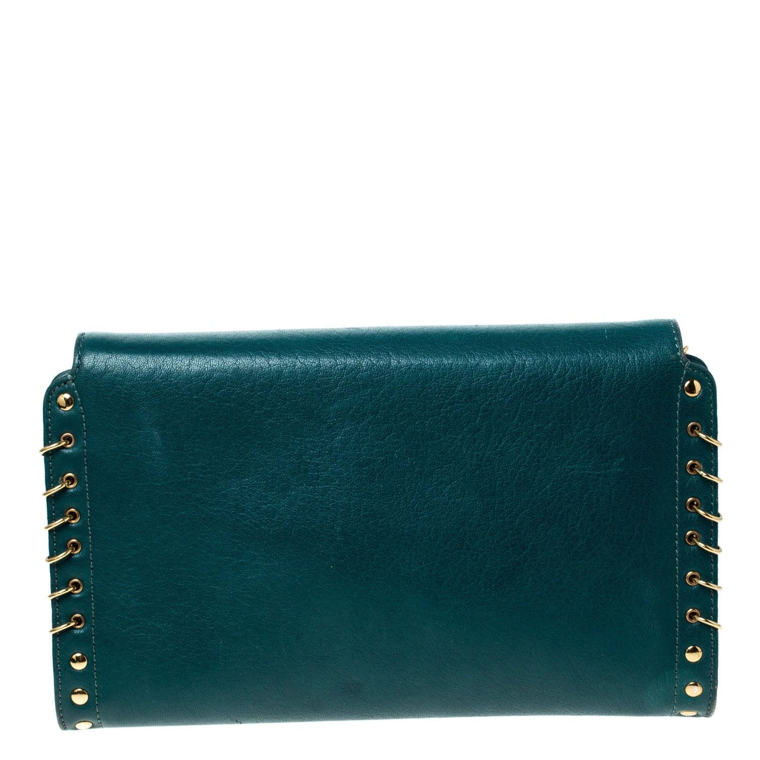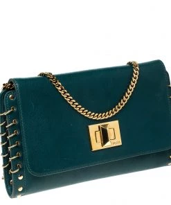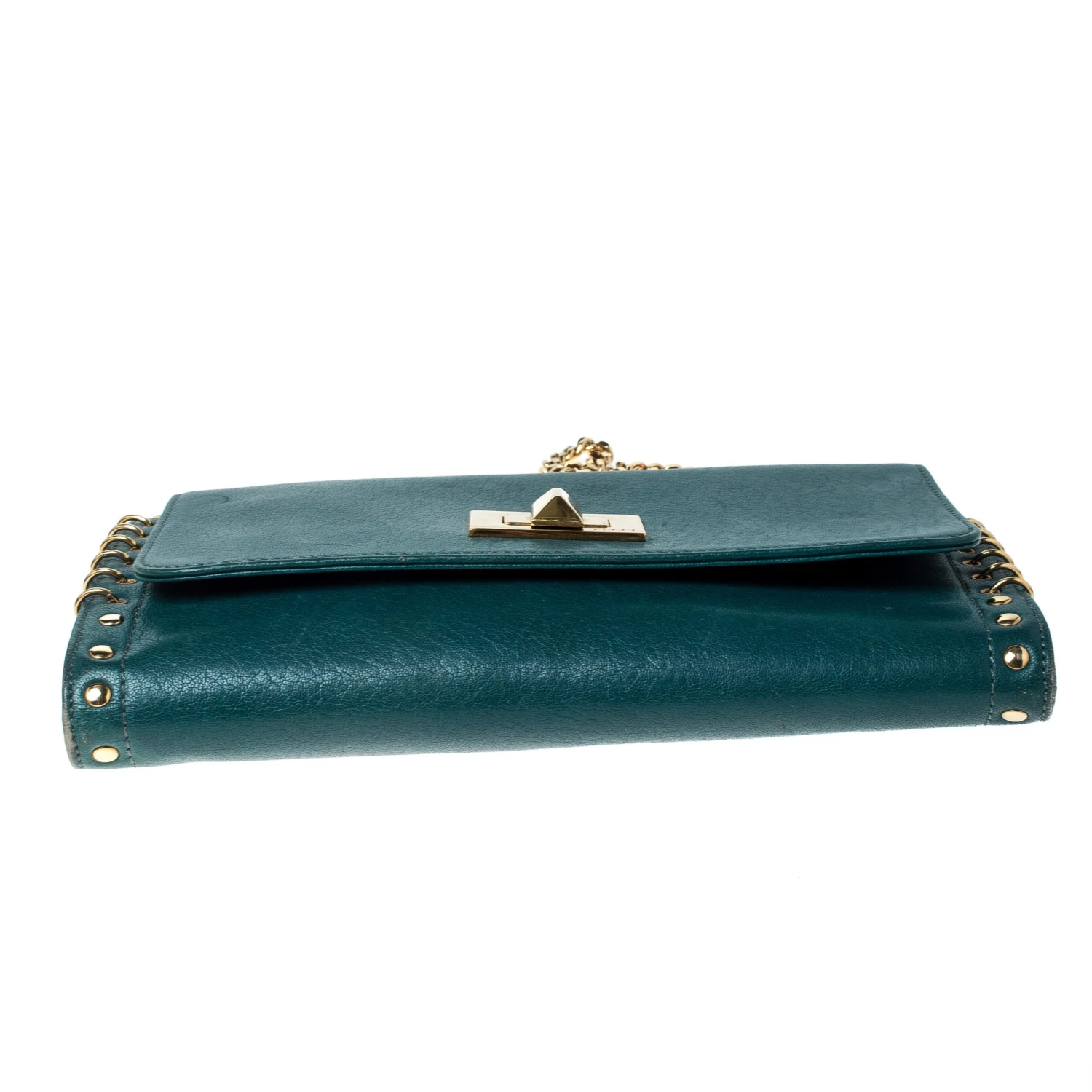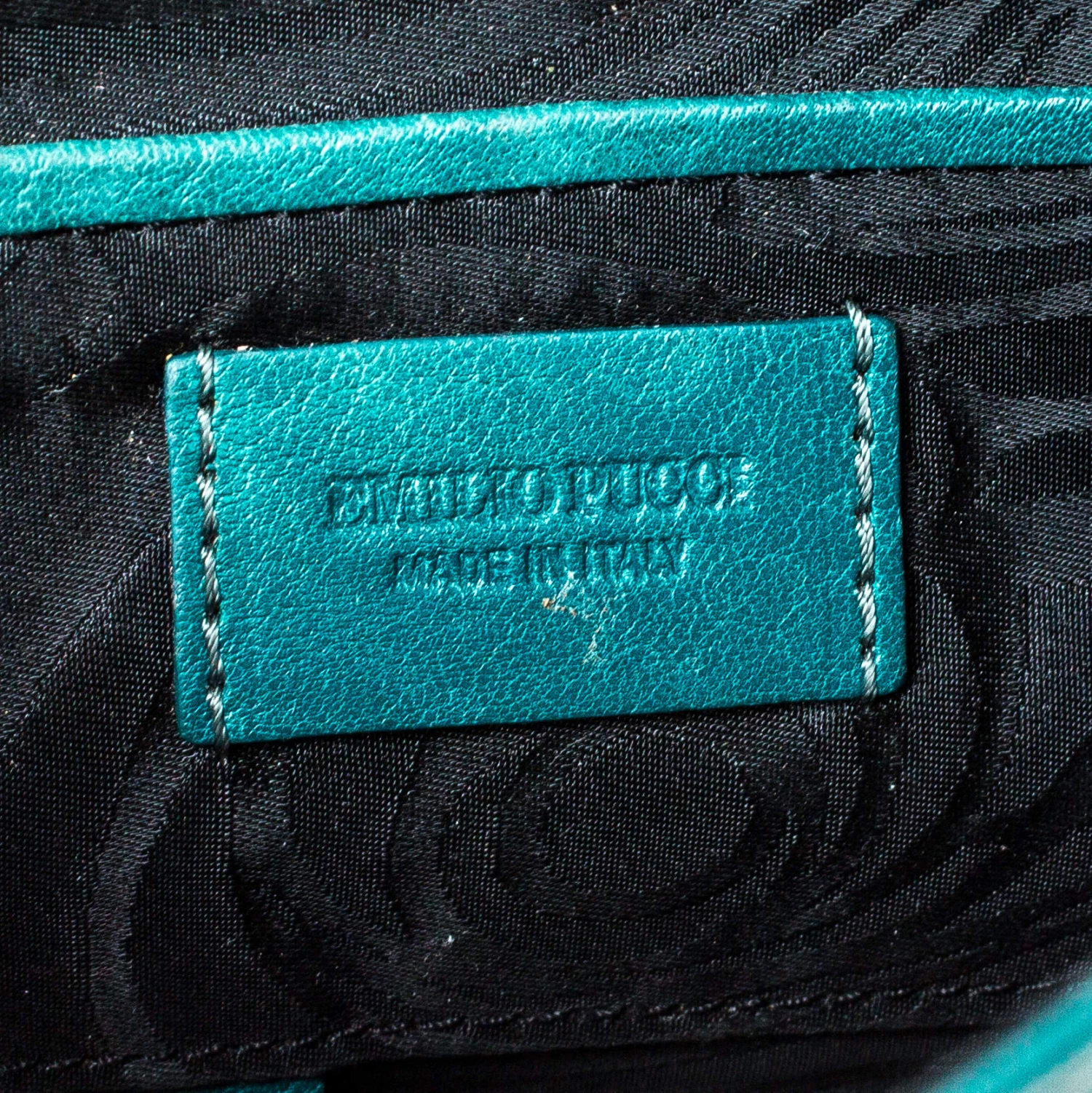 This turquoise number by Emilio Pucci is the perfect statement bag! The glorious color of the leather is complemented by classic gold-finish hardware and a long chain strap, so that one can wear it as a cross-body as well. The interior is lined with fabric and the flap is shut tight with a sleek lock closure that has an engraved logo.