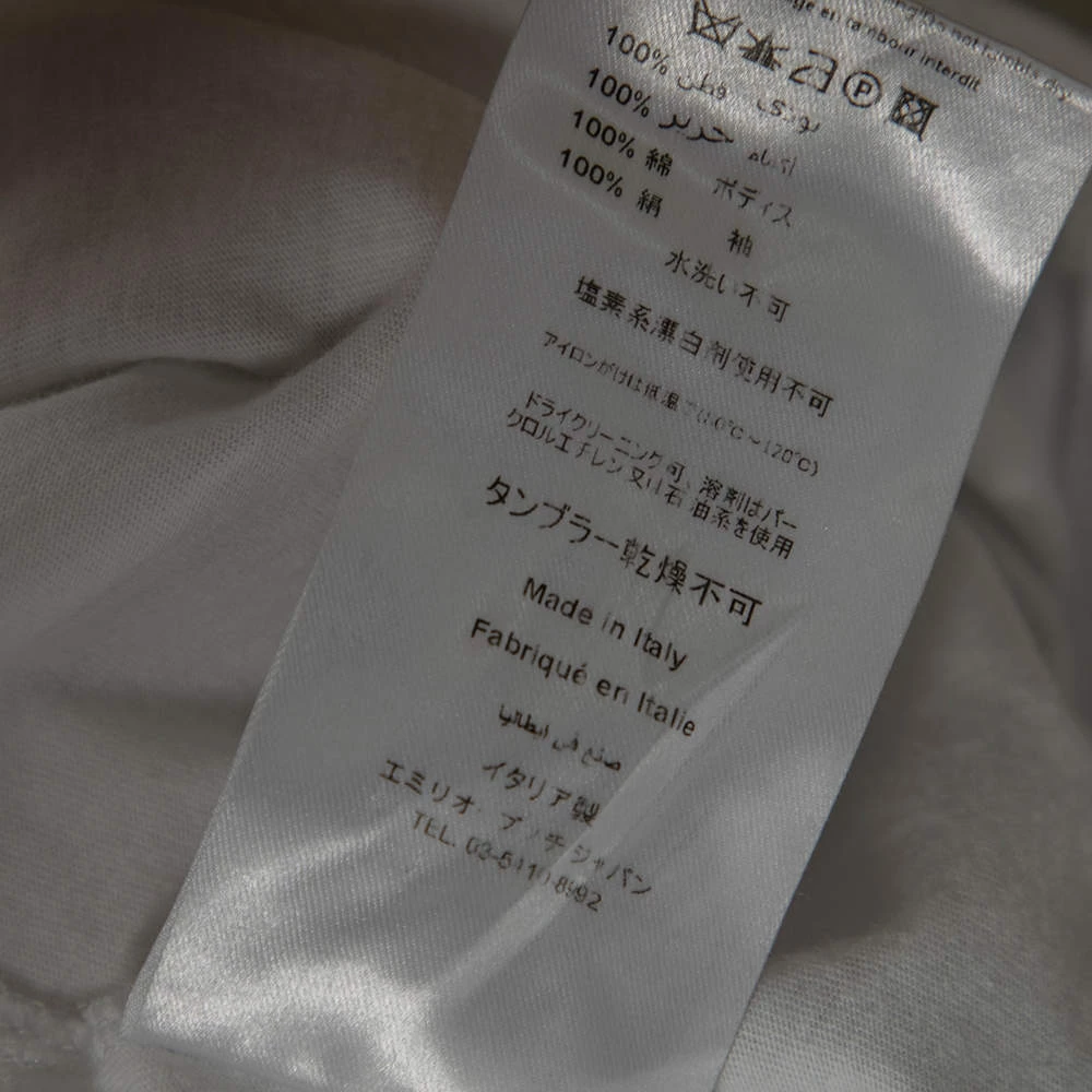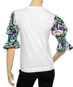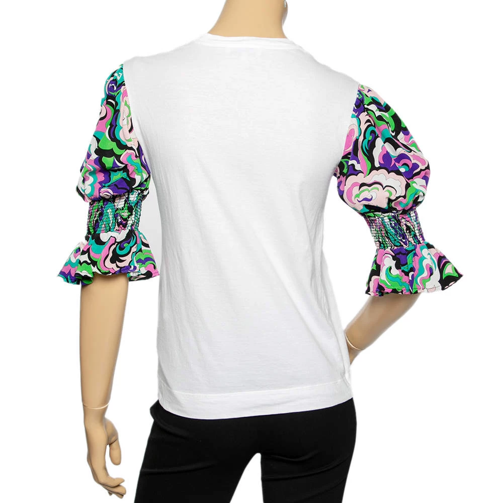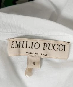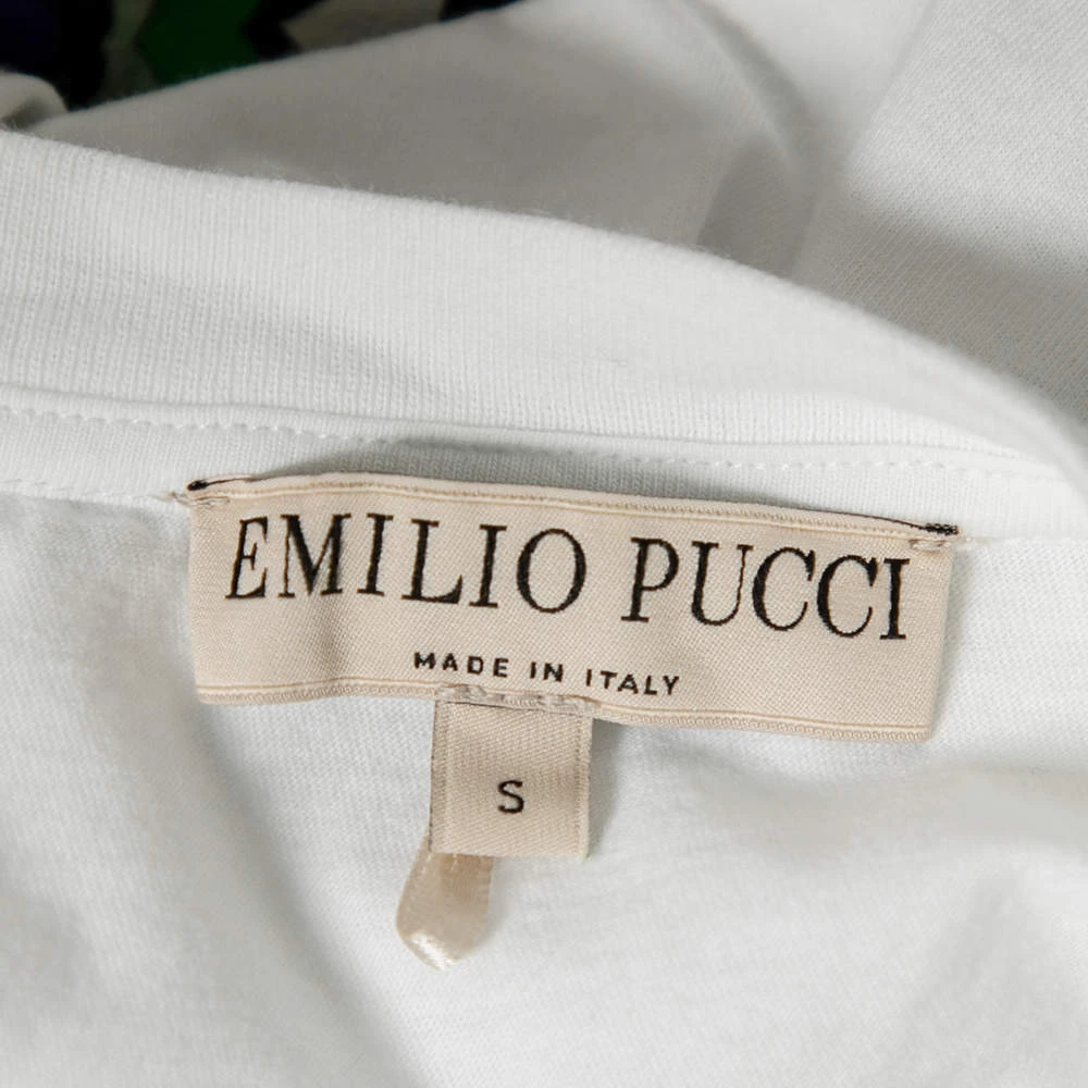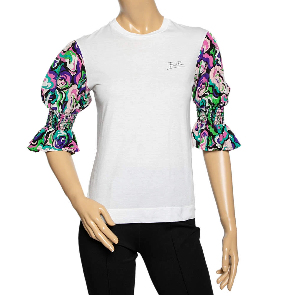 Known for its fancy and colorful prints, this T-shirt from the House of Emilio Pucci grants your a versatile style with a hint of color. It is made from white cotton fabric, which is embellished with contrast colorful sleeves. This Emilio Pucci creation will surely be your favorite pick in no time!