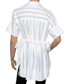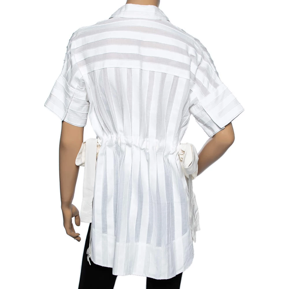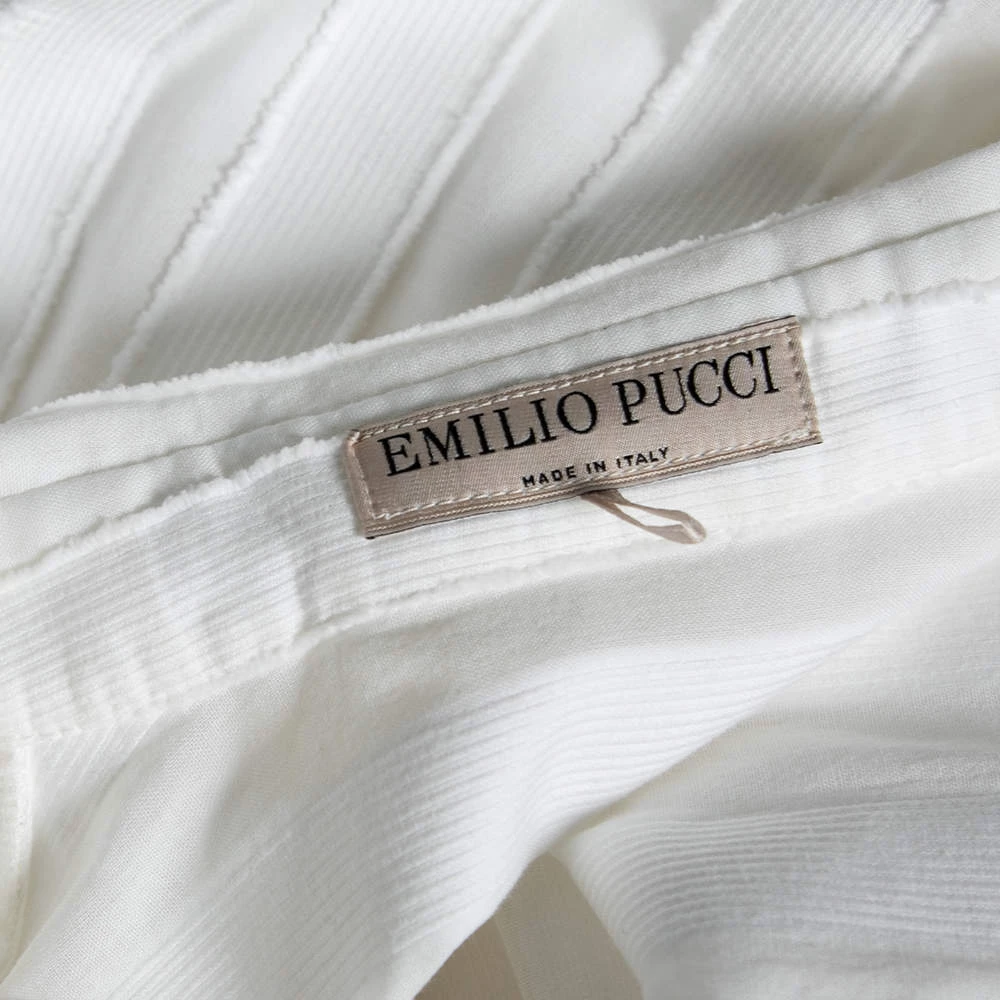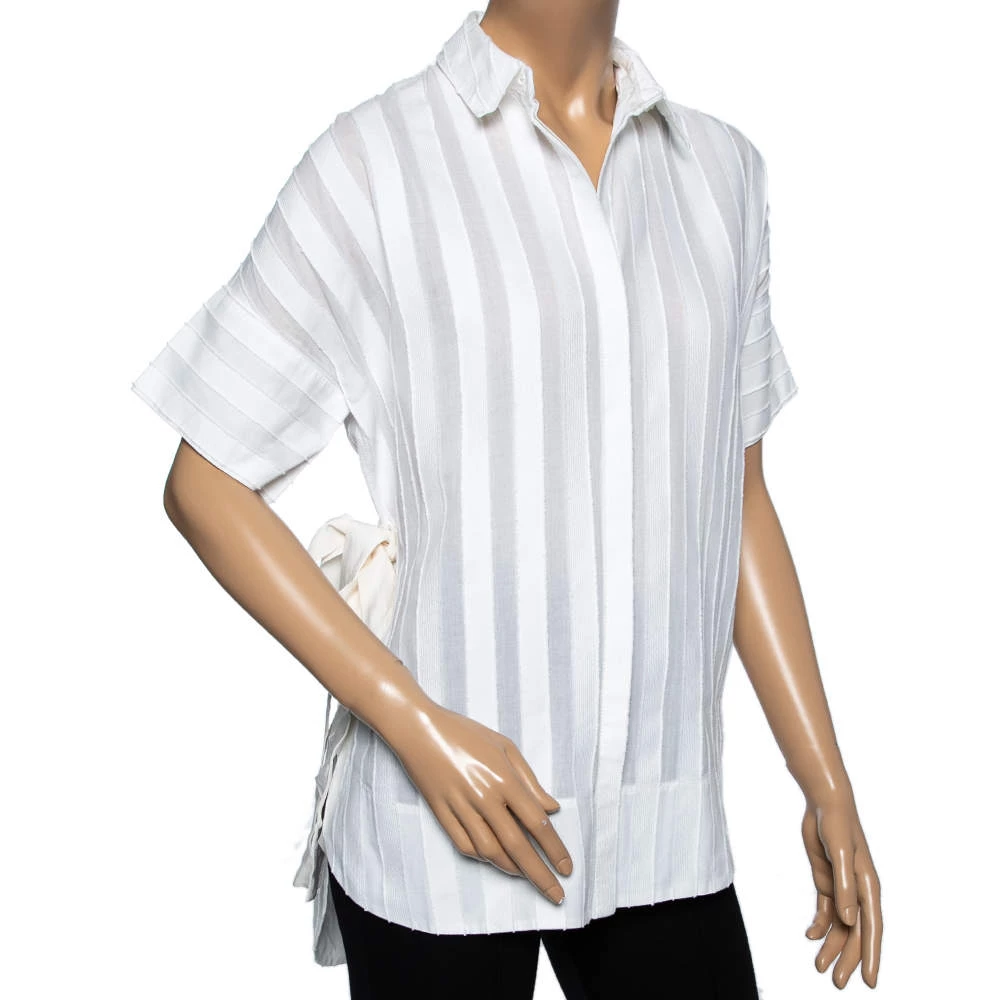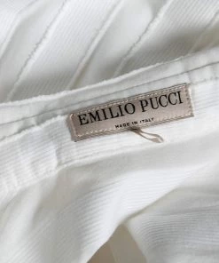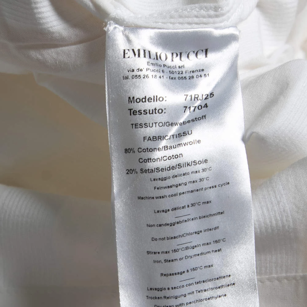 This white shirt is an ideal example of comfort and elegance. From the house of Emilio Pucci, it is designed exquisitely using cotton and silk with short sleeves and tie detail on the sides. Complement the shirt by wearing it with trousers and heels.