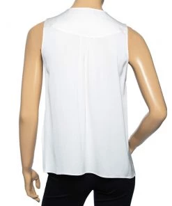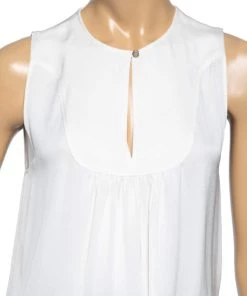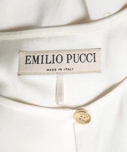 This blouse from the House of Emilio Pucci is a stunning creation you need to own today! It is tailored using white silk fabric and is accentuated with pleated formations on the front. It has a sleeveless style and buttoned closure. Achieve a chic style as you don this beautiful blouse.